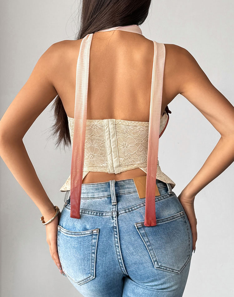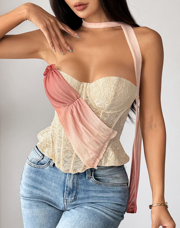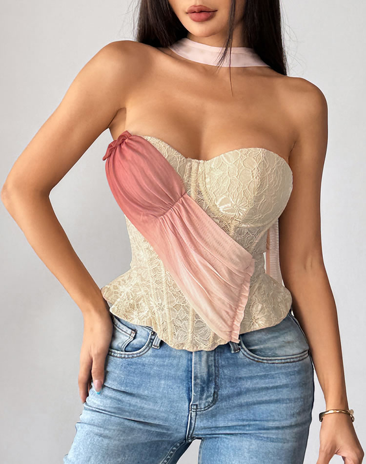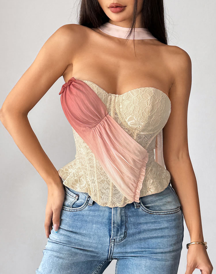 This elegant asymmetric lace corset top features a unique design with a draped fabric detail that adds a touch of sophistication. The intricate lace pattern and supportive cups ensure both comfort and style, making it perfect for pairing with jeans or skirts. Ideal for those who want to feel confident and trendy in their everyday wear.