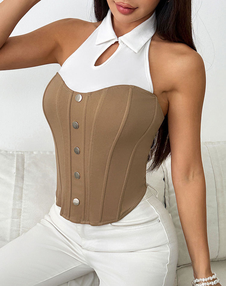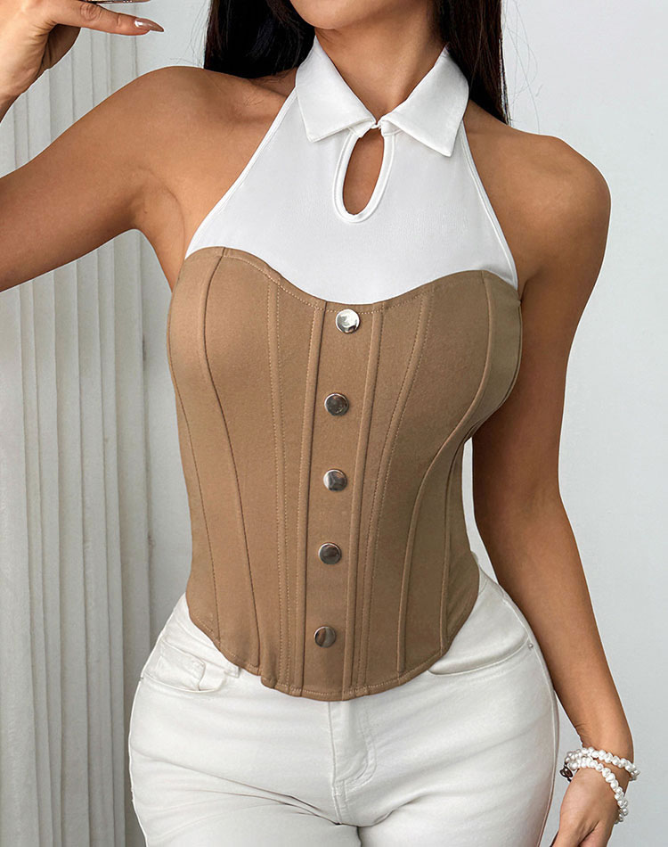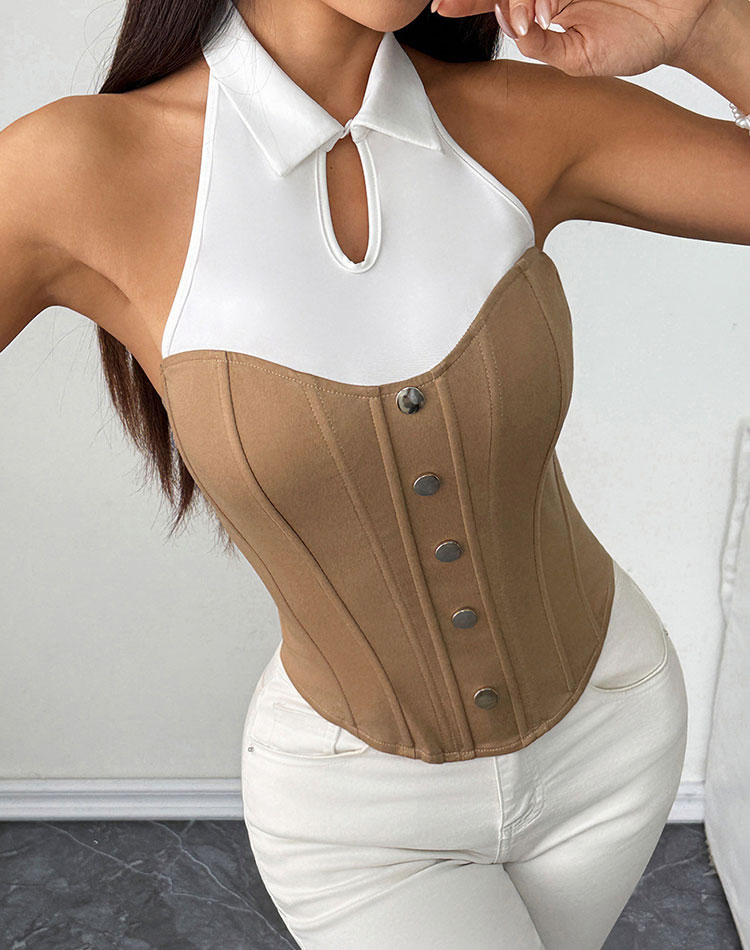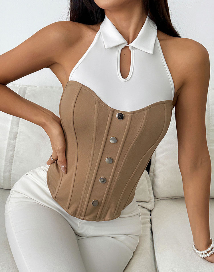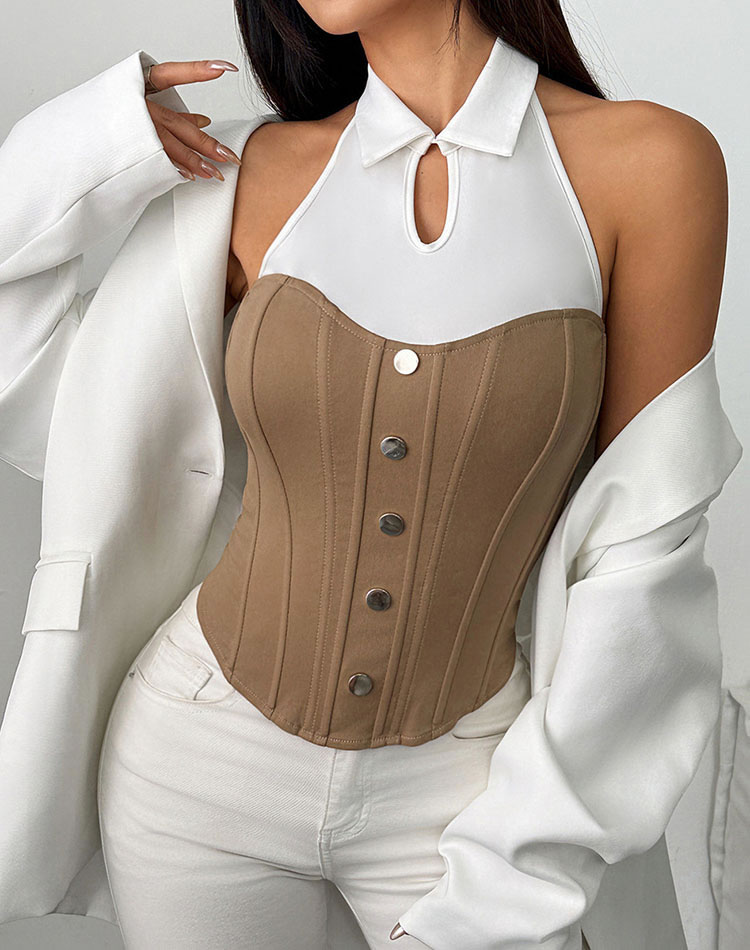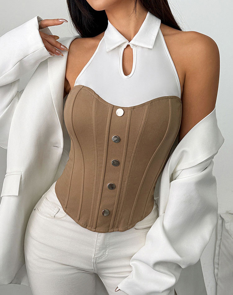 This elegant beige corset features sleek button detailing that adds a modern twist to its classic design. The structured silhouette accentuates the waist, creating a flattering hourglass shape. Perfect for layering under blazers or pairing with high-waisted pants for a chic and sophisticated look.