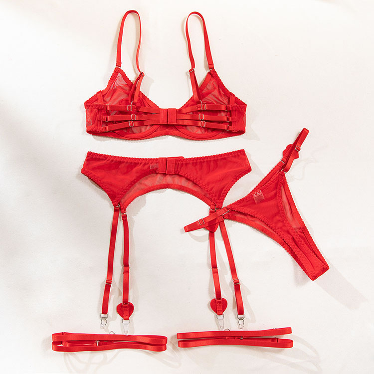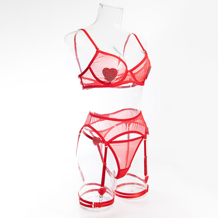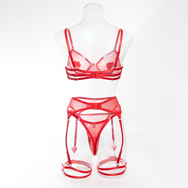 Celebrate love with this stylish red lingerie set. The bra boasts heart-shaped accents that add a whimsical touch, while the underwire design provides support and comfort. The garter belt and stockings complement the set beautifully, featuring matching heart embellishments. This set is perfect for anyone looking to embrace a fun and flirty vibe in their intimates