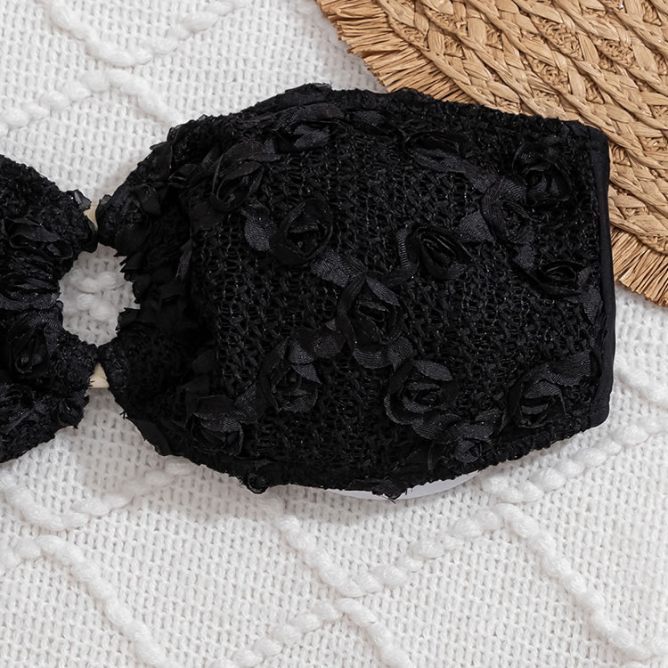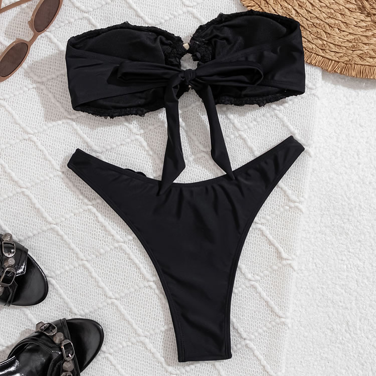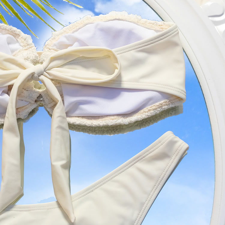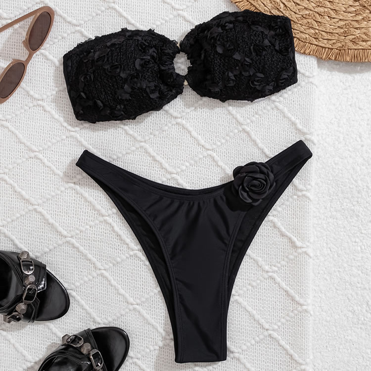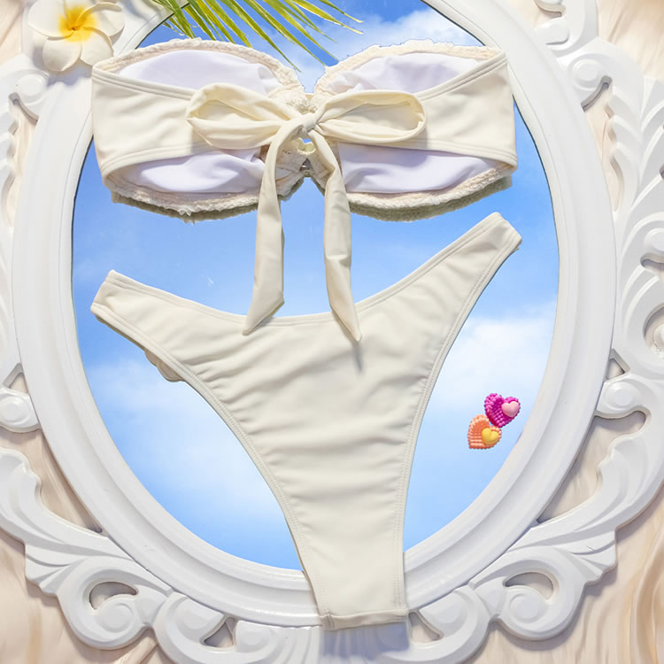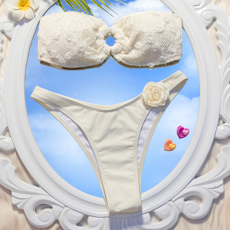 Make heads turn in this stylish white two-piece swimsuit featuring a floral accent. The crochet bandeau top pairs beautifully with the high-cut bottoms adorned with a flower detail. This set ensures you feel alluring and trendy during your beachside moments.