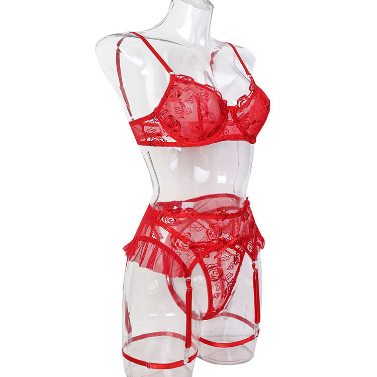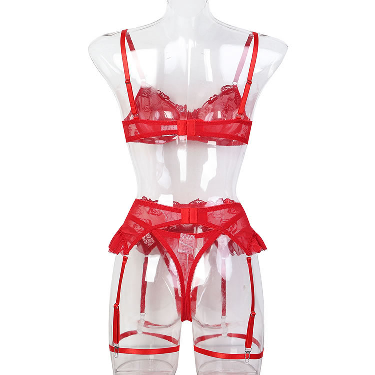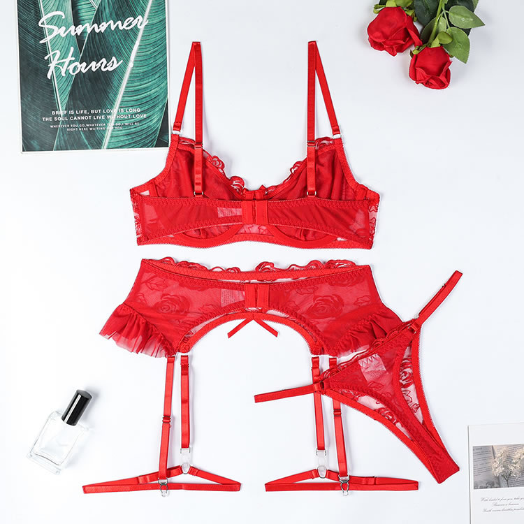 This captivating red lace bra and garter set features intricate floral patterns that add a touch of romance and allure. The combination of soft mesh fabric and bold red accents creates a striking contrast, while the adjustable straps ensure a comfortable fit. Perfect for those who want to feel confident and irresistible in their intimate moments.