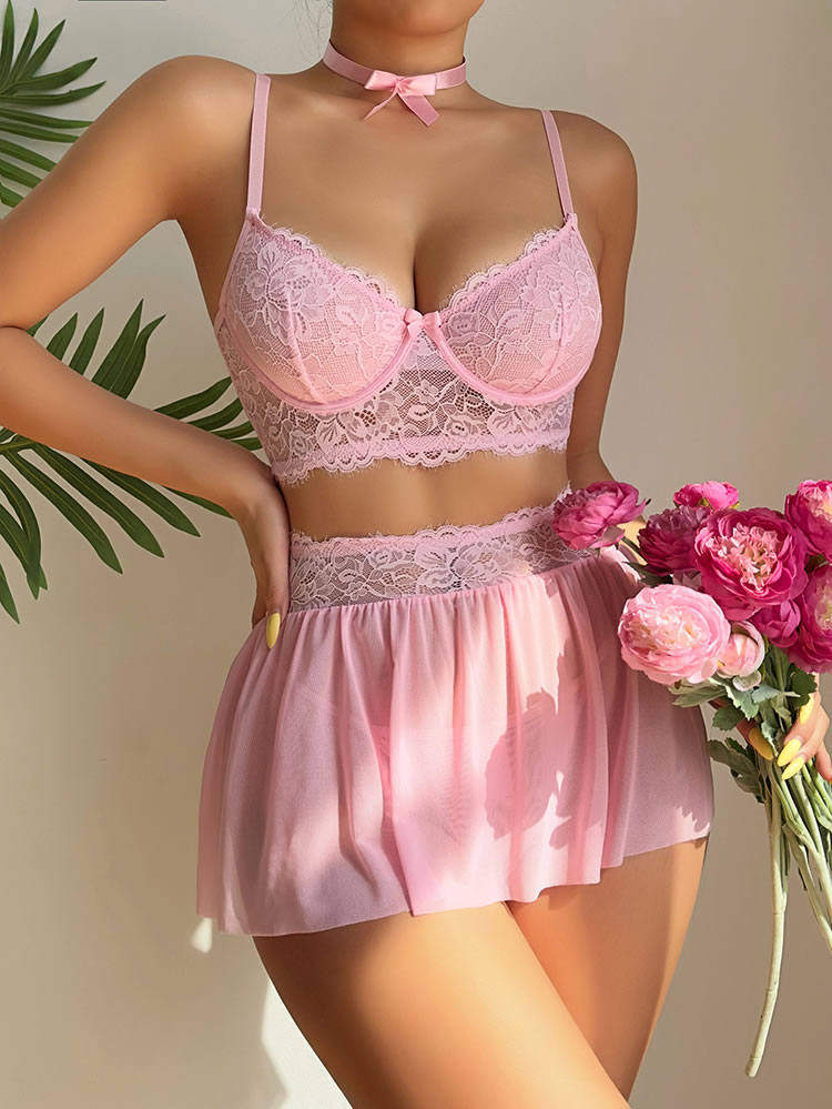 This charming pink babydoll set features a delicate lace bralette with underwire support and a flowing sheer skirt for a sweet and romantic look. Accentuated with a matching thong and a dainty ribbon choker, it’s perfect for adding elegance and softness to any intimate occasion.