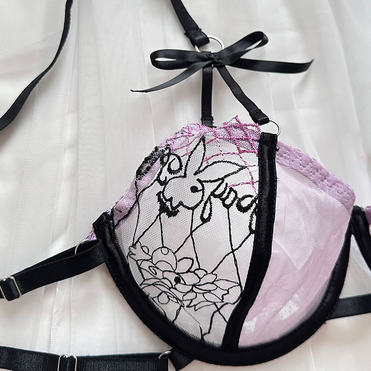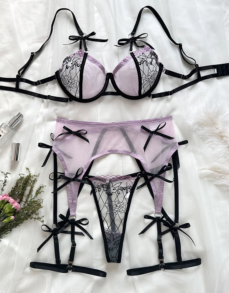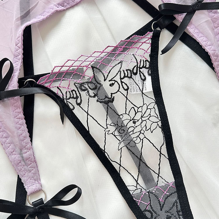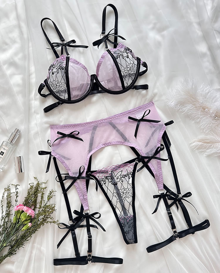 Ignite the evening with this enchanting lace bra set. It features sheer underwire cups, adjustable spaghetti straps, and a hook and eye back closure. The set includes a matching high-waisted garter belt with adjustable straps, wraparound leg garters, and a coordinating thong panty, all designed to captivate and charm. Perfect for a night of irresistible allure.