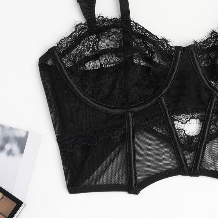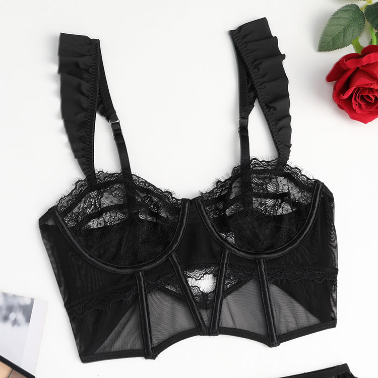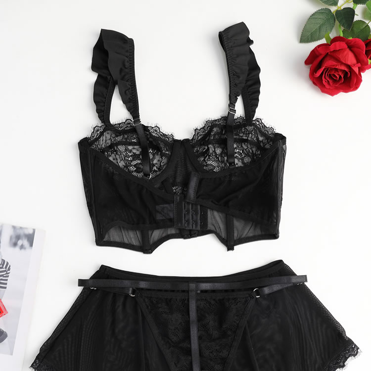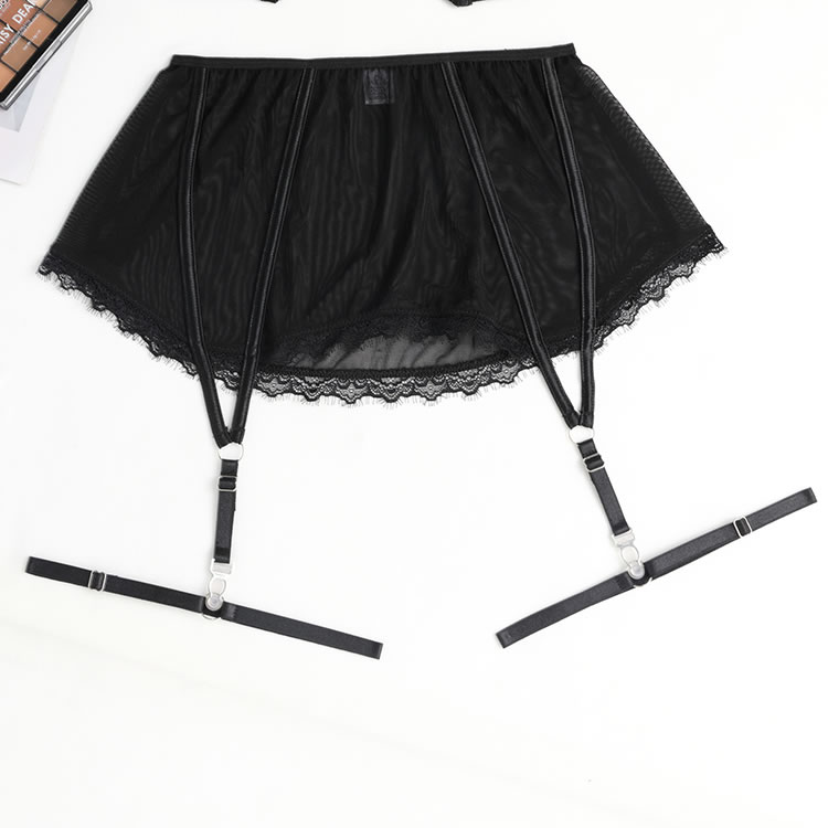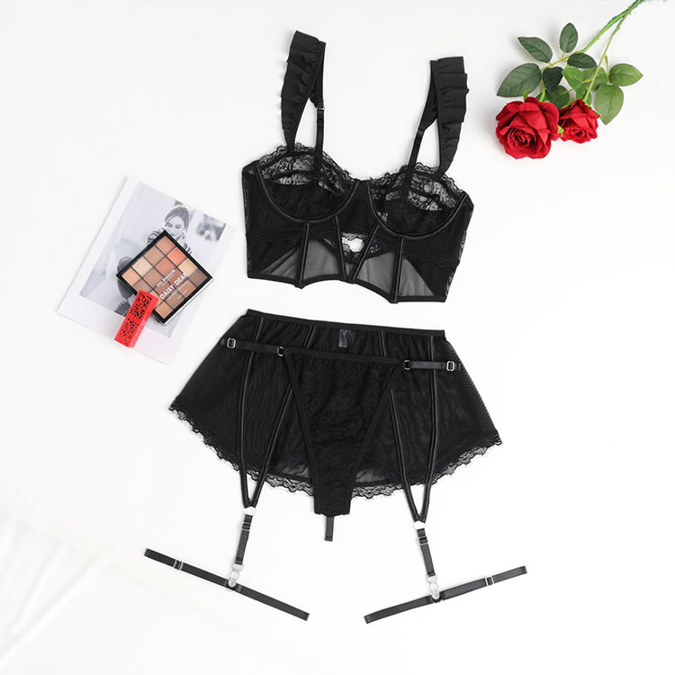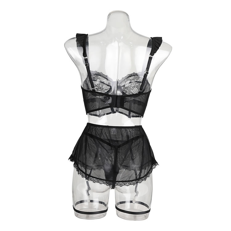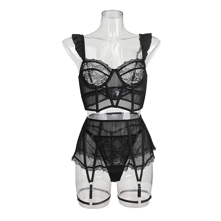 Ignite his desire with this flirty bra set. Featuring sheer lace underwire cups and a chic longline underbust, it offers a blend of elegance and allure. The adjustable spaghetti straps and hook and eye back closure ensure a perfect fit, while the matching high-waisted garter belt with adjustable garter straps and wraparound leg garters adds a sultry touch. Complete with a matching thong panty, this set is designed to make you feel confident and irresistible.