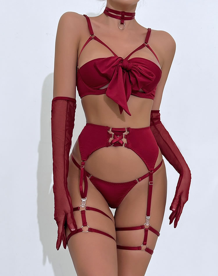 Slip into something sexy like this sultry bra set featuring open underwire cups with satin bow ties detailing, adjustable spaghetti straps, a hook and eye back closure, a matching garter belt with adjustable garter straps, wraparound leg garters, choker, long gloves, and a matching panty.