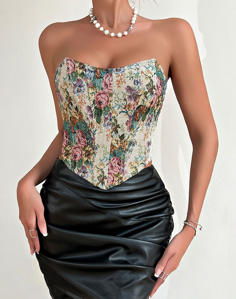 This elegant corset top features a sweetheart neckline with a rich floral printed design. The structured fit provides support and shape, making it perfect for both formal events and stylish outings.