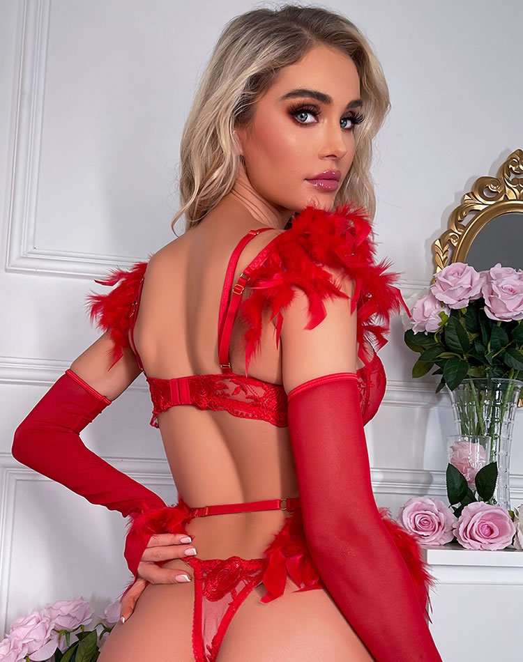 Embrace your most glamorous self in this stunning bra set featuring underwire cups with floral embroidery, adjustable spaghetti straps with feather trim, a hook and eye back closure, a matching high waisted garter belt, gloves, and a matching panty with a thong cut back.