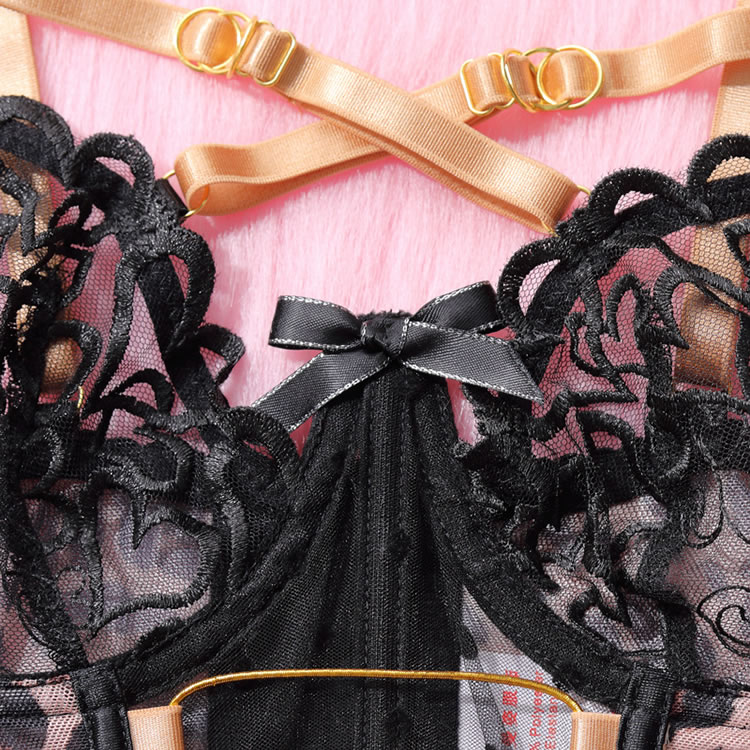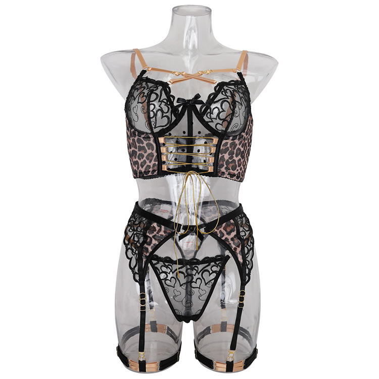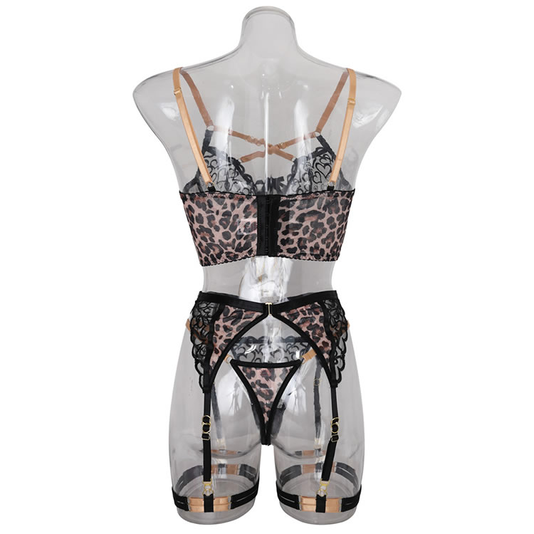 Captivate your lover with subtle seduction in this alluring leopard-print bra set. This enticing four-piece ensemble features an underwire bra with adjustable spaghetti straps and a hook-and-eye back closure, a garter belt with adjustable straps, wraparound leg garters, and a matching thong panty. Unleash your wild side with this irresistible set.