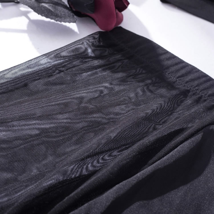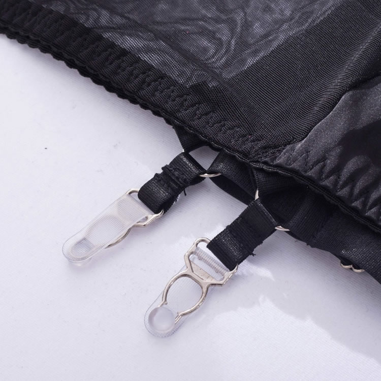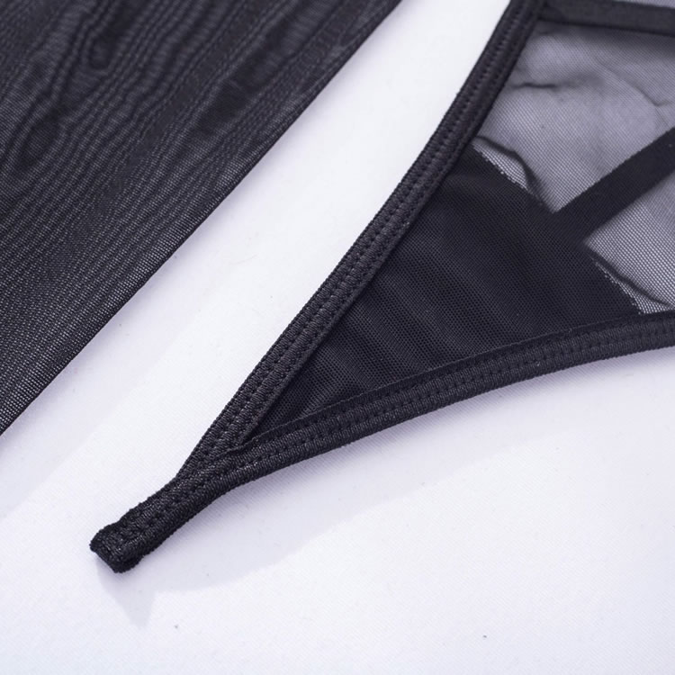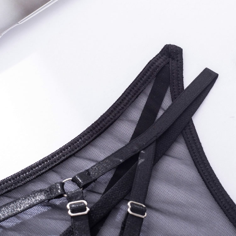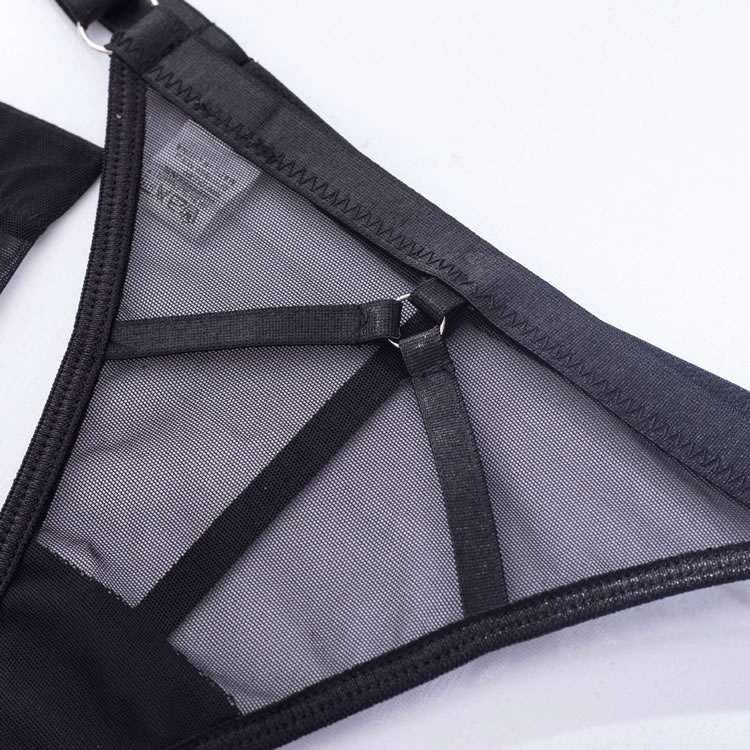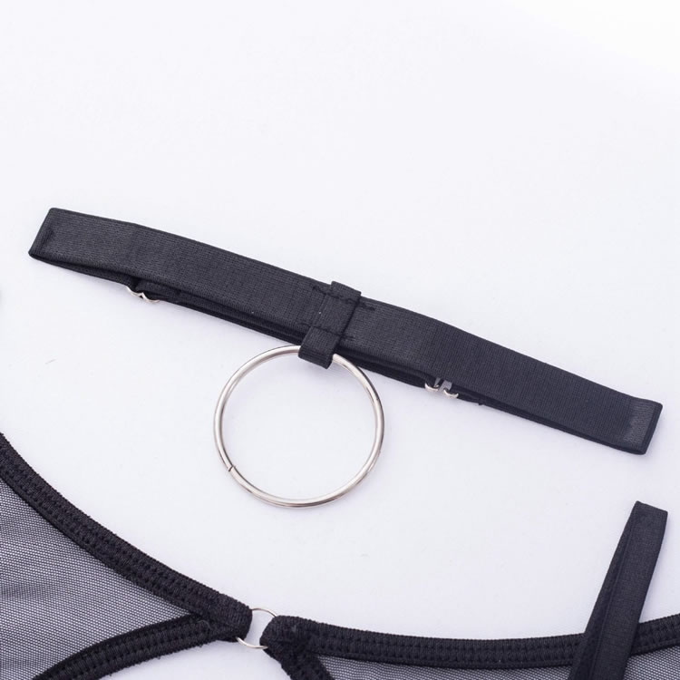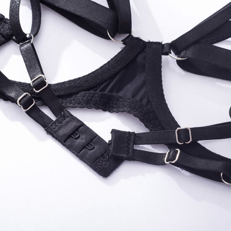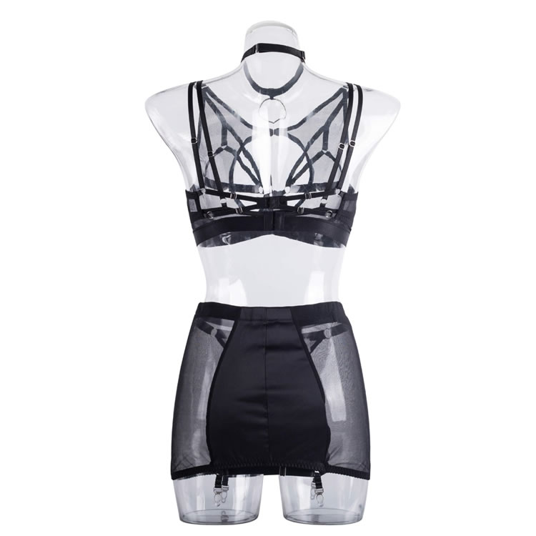 Wrap your body in love. Arouse your innermost desires in this exclusive geometric inspired bra set featuring a multi-strapped neckline, a choker with O-ring accents, a cut-out bust, sheer mesh underwire cups, a hook and eye back closure, a high waisted skirt with garter straps, wraparound leg garters, and a strappy panty.