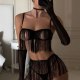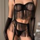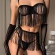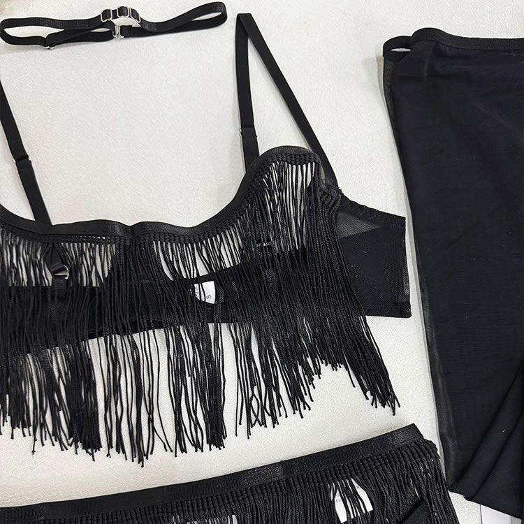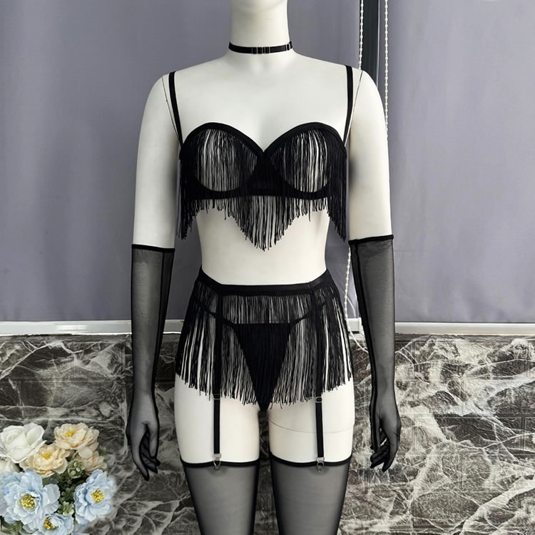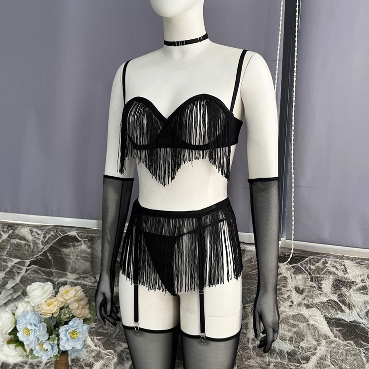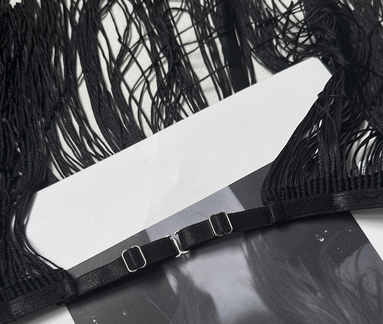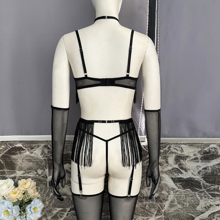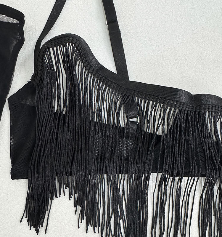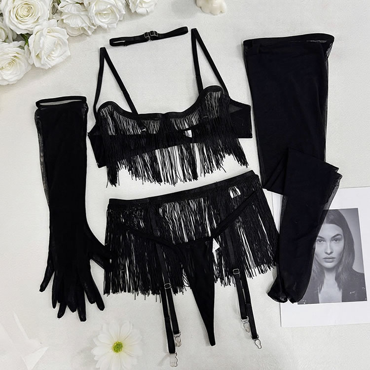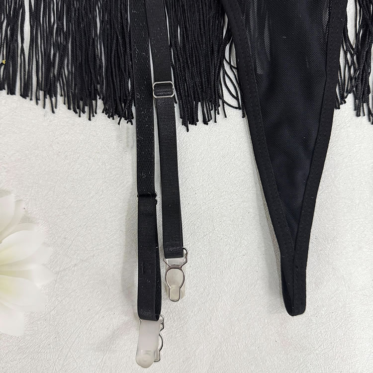 This bold black lingerie set features a fringe-adorned bustier with sheer mesh panels and thin straps, creating a dynamic silhouette. The matching high-waisted bottom is trimmed with cascading tassels that sway with movement, adding drama and flair. Paired with long mesh gloves and garter straps, it’s designed for those who enjoy expressive, statement-making styles.