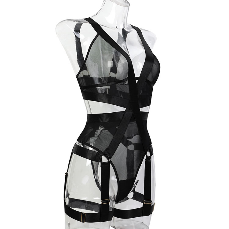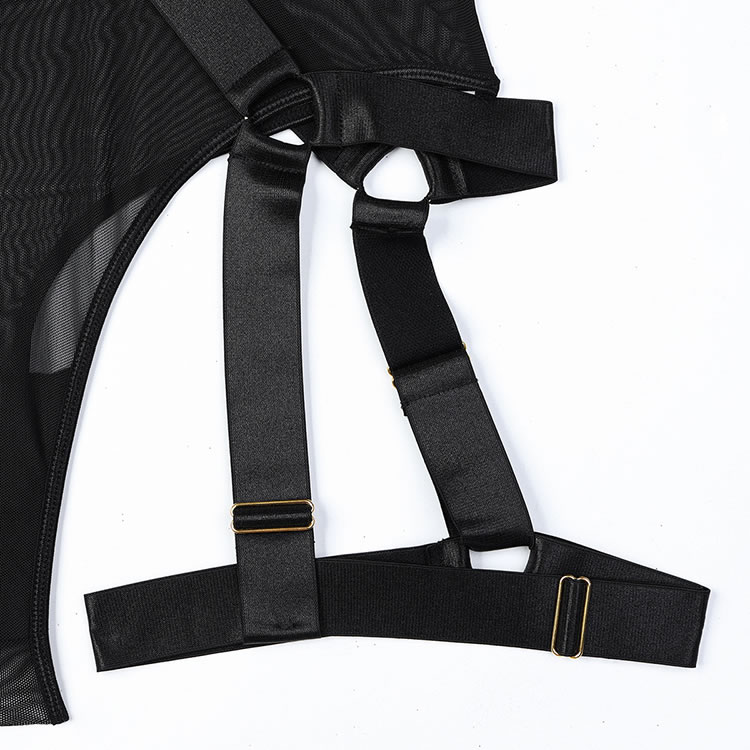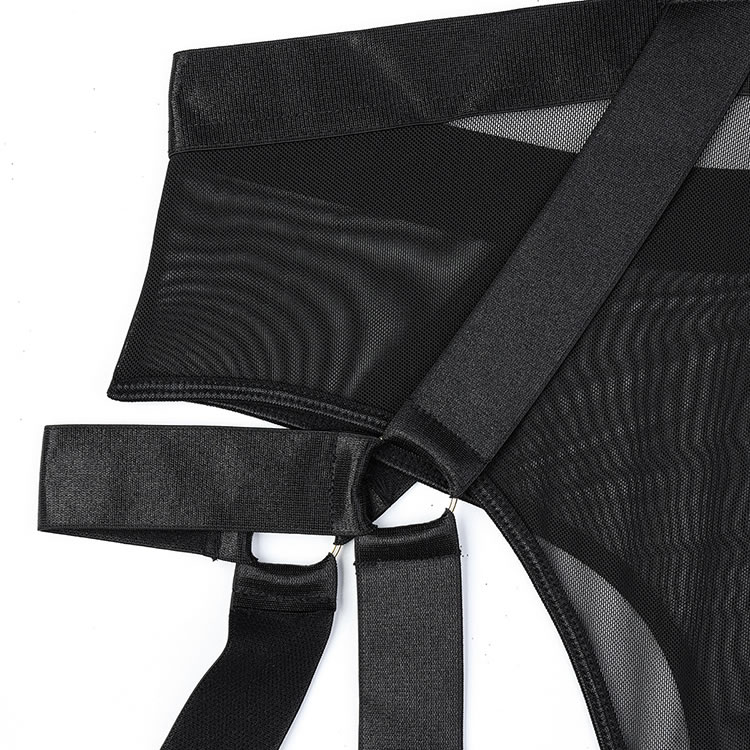 Prepare for a night of thrilling seduction in this enticing teddy. Featuring sheer mesh triangle cups and adjustable shoulder straps, it boasts a daring cut-out bodice and a hook back closure. The adjustable garter straps and wraparound leg garters add allure, while the cheeky cut back ensures a tantalizing finish. Perfect for an unforgettable evening, this teddy will leave a lasting impression.