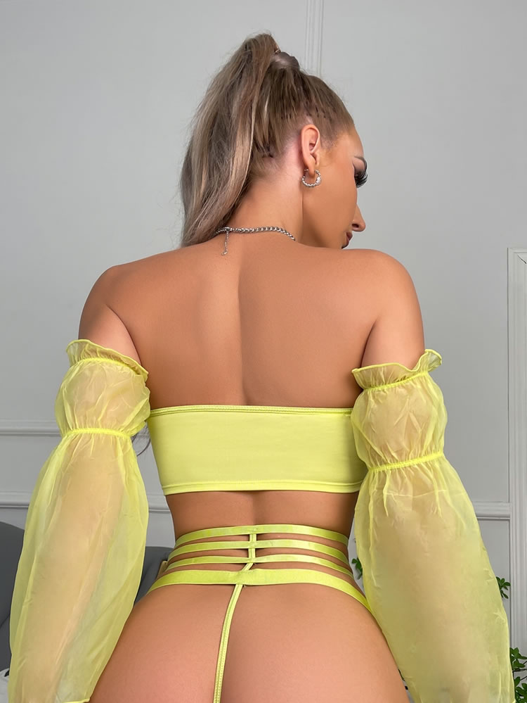 Put on a seductive show in this exclusive bra set featuring an off-the-shoulder neckline, long sleeves, and a matching panty with a thong cut back, adjustable garter straps, and adjustable leg garters.