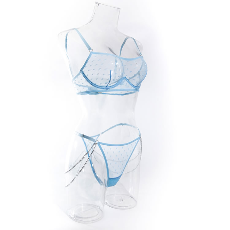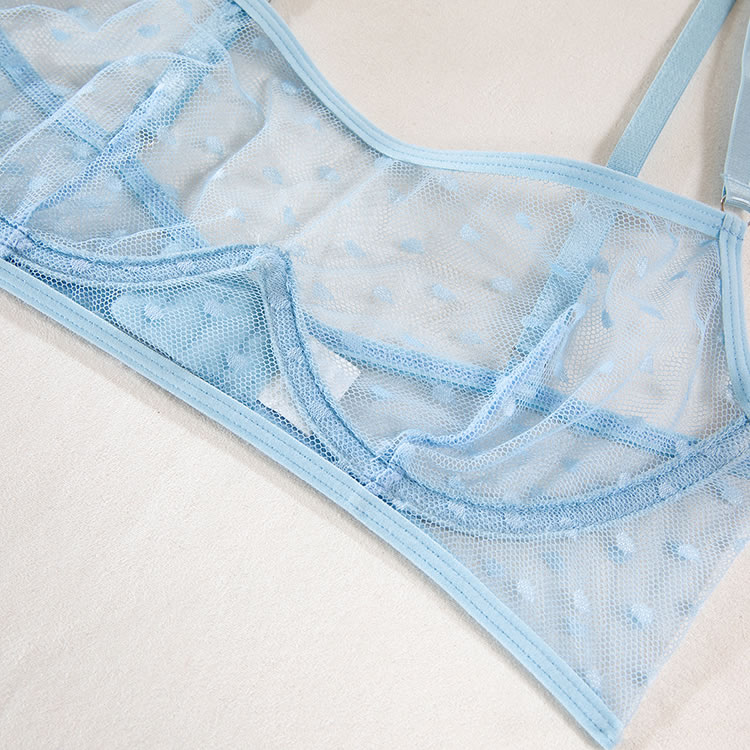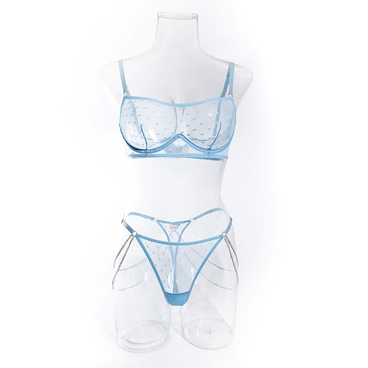 Put on a seductive show in this exclusive bra set featuring sheer mesh underwire cups, a straight neckline, adjustable spaghetti straps, a hook and eye back closure, and a matching panty with a thong cut back.