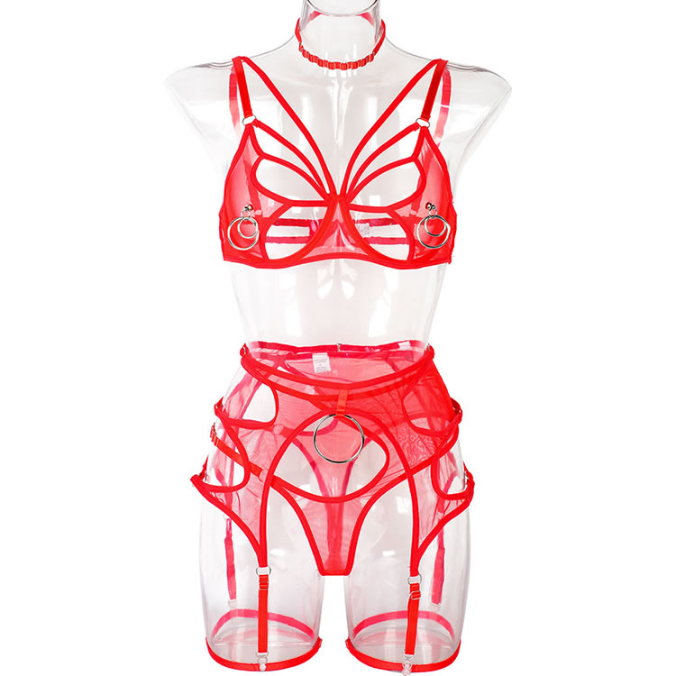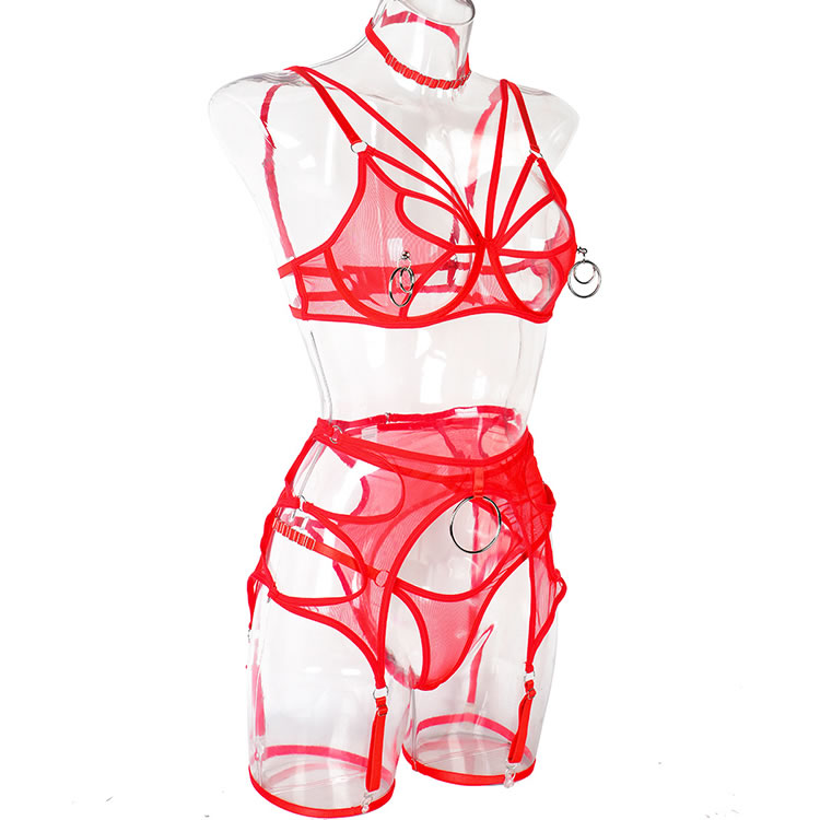 Ignite passion in your partner with this alluring bra set that exudes sensuality. Revel in the provocative details, from the sheer mesh peekaboo underwire cups adorned with O-ring accents to the adjustable spaghetti straps. The captivating cage-style back band, secured with a hook and eye closure, adds an extra layer of intrigue. Complete the enchantment with the strappy high waist panty featuring a cheeky cut back, along with the matching garter belt equipped with adjustable garter straps and wraparound leg garters. (Choker included.) Elevate the intensity and embrace the allure of this seductive lingerie ensemble.