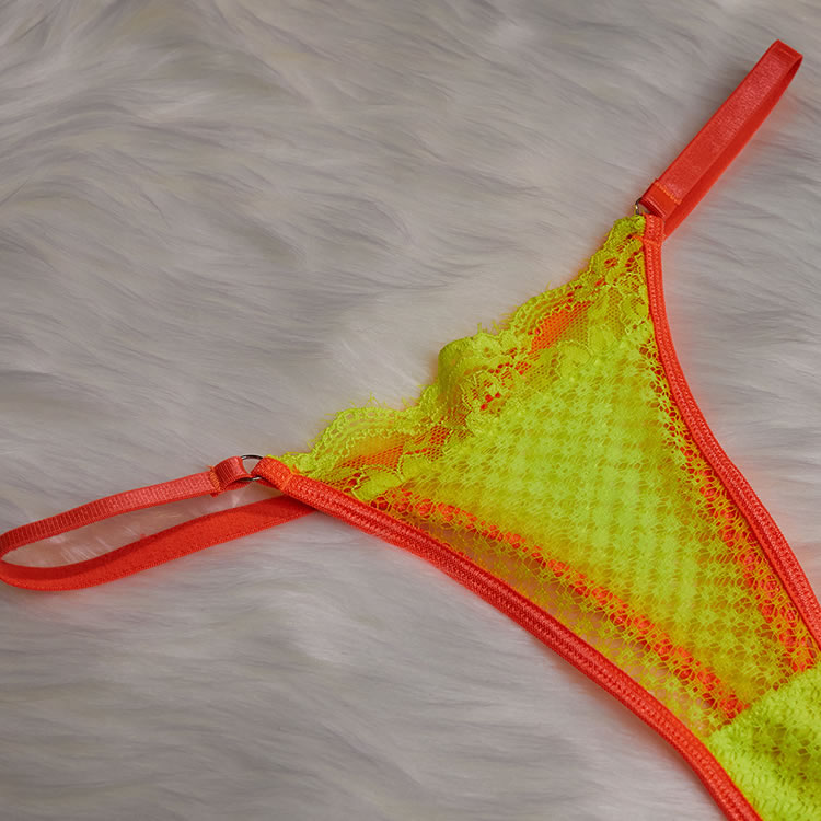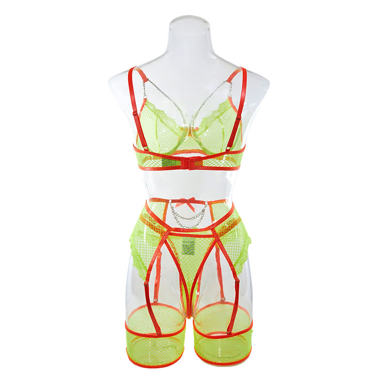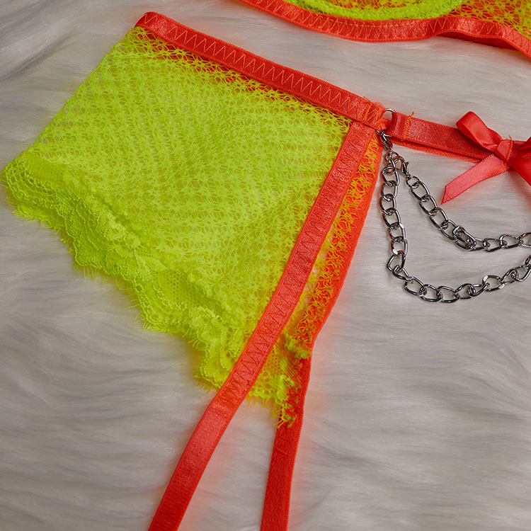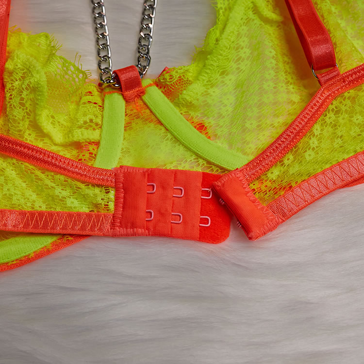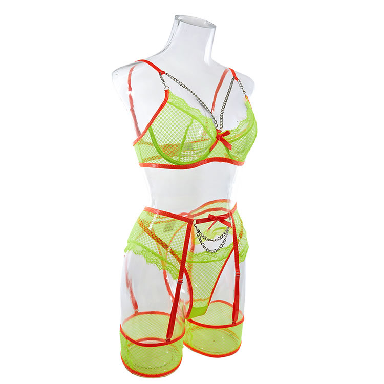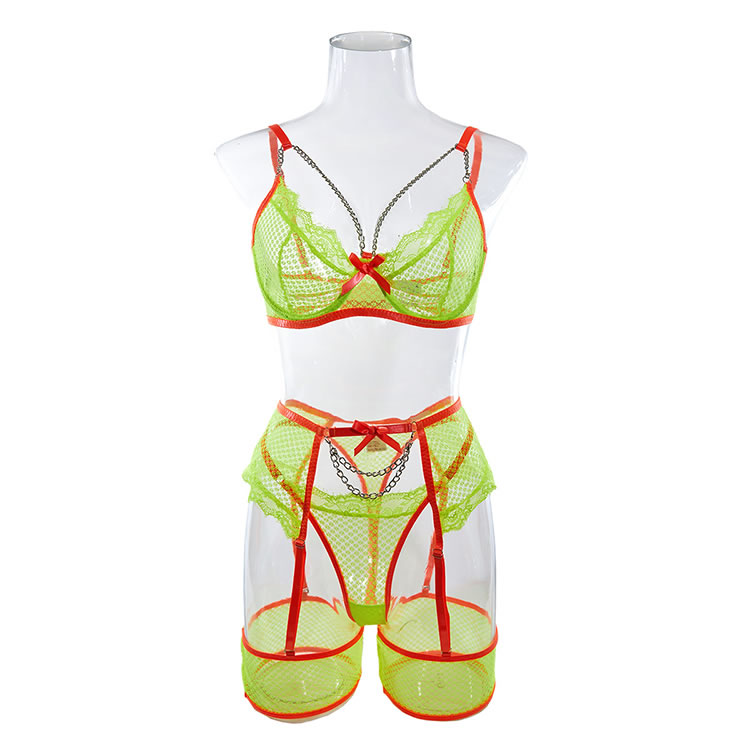 Have a night filled with passion in this enticing exclusive lace bra set featuring sheer lace underwire cups with a chain detail, adjustable spaghetti straps, a hook and eye back closures, a matching garter belt with adjustable garter straps, wraparound leg garters, and a matching panty with a thong cut back.