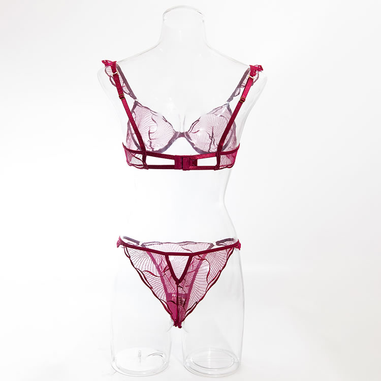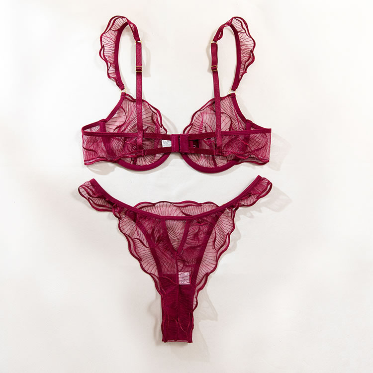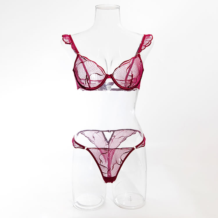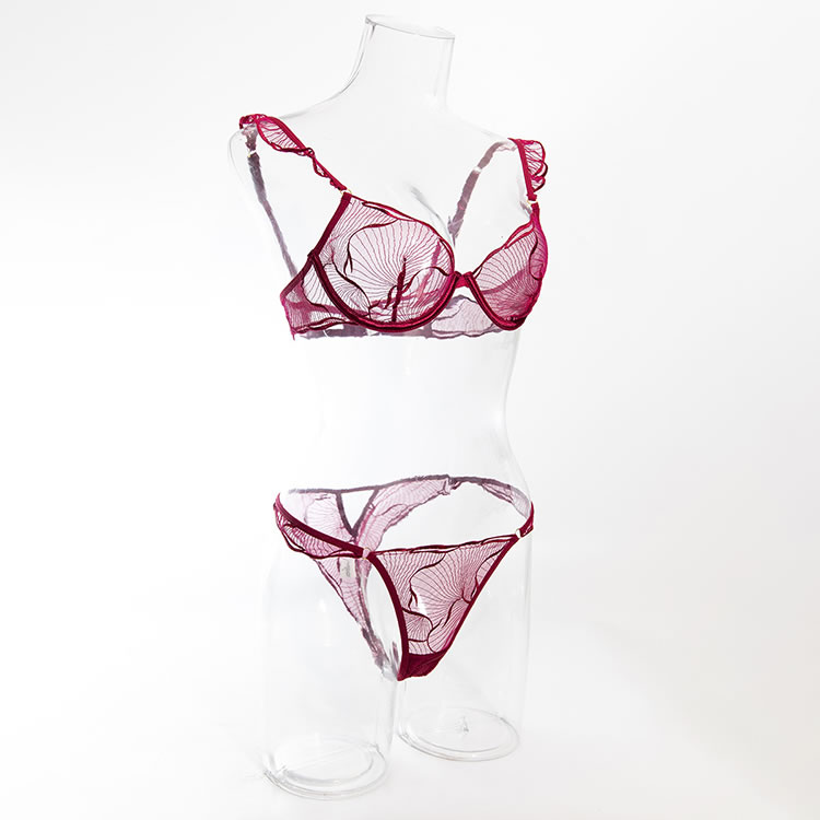 This lingerie set features a bold burgundy color that exudes confidence and style. The sheer fabric with intricate lace detailing on the bra and panty creates a visually stunning effect, while the soft material ensures all-day comfort. Perfect for adding a touch of allure to your wardrobe.