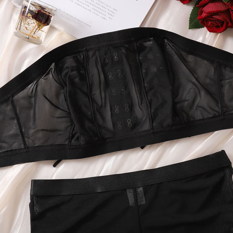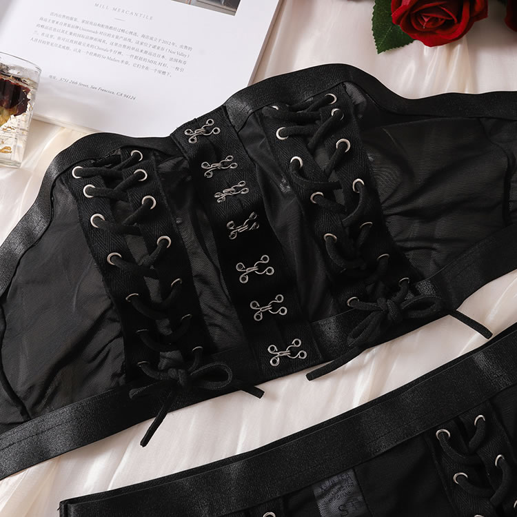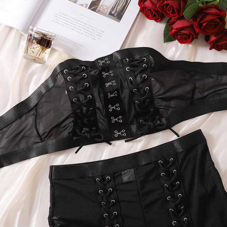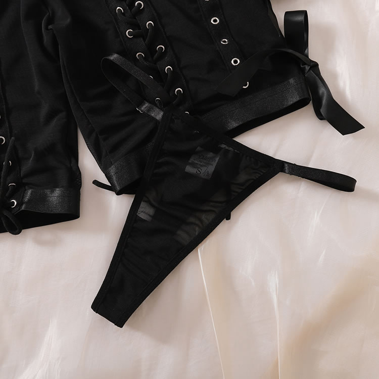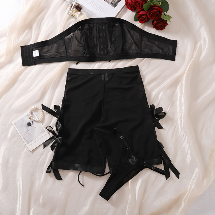Steal the spotlight in this daring dance set, featuring a bandeau top with eye-catching criss-cross details and sheer cups. Complete the look with matching mesh bike shorts and a coordinating thong panty, designed to turn every head your way.