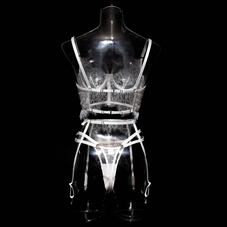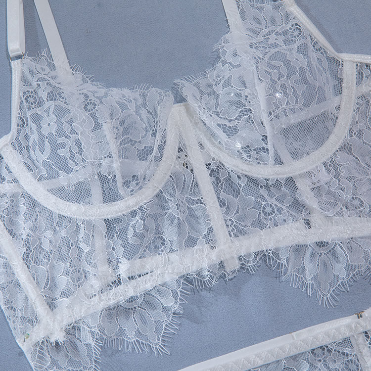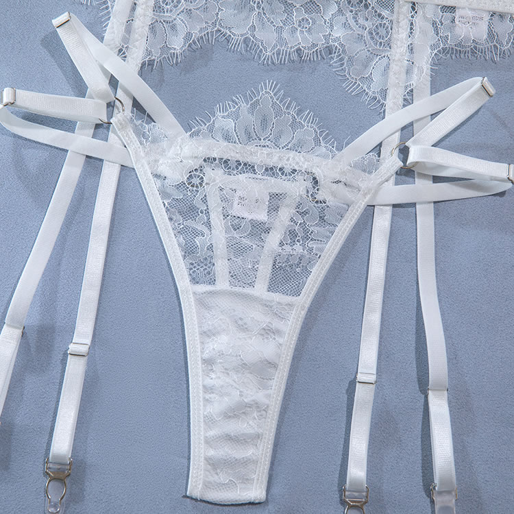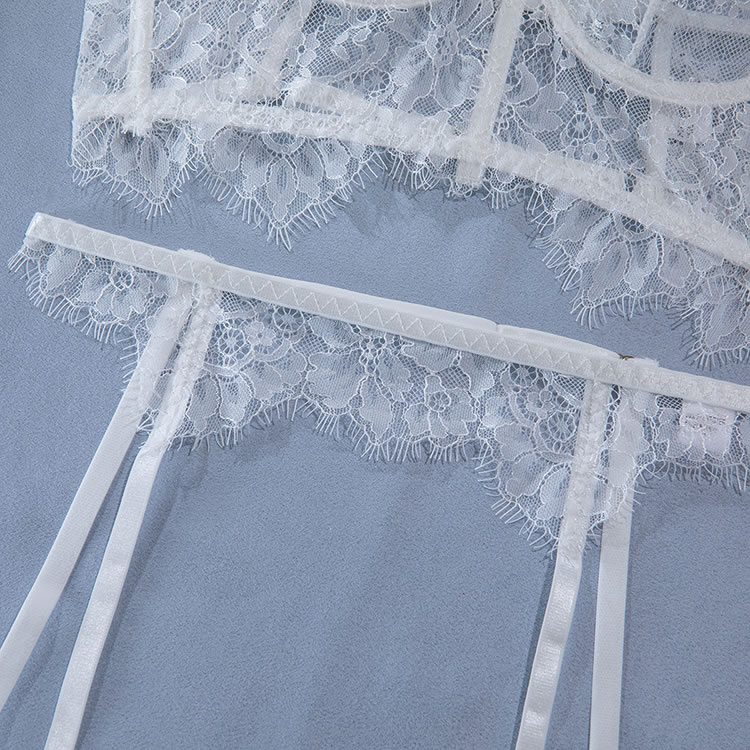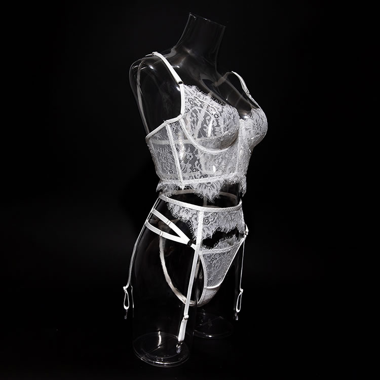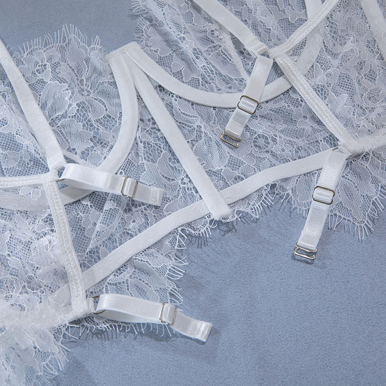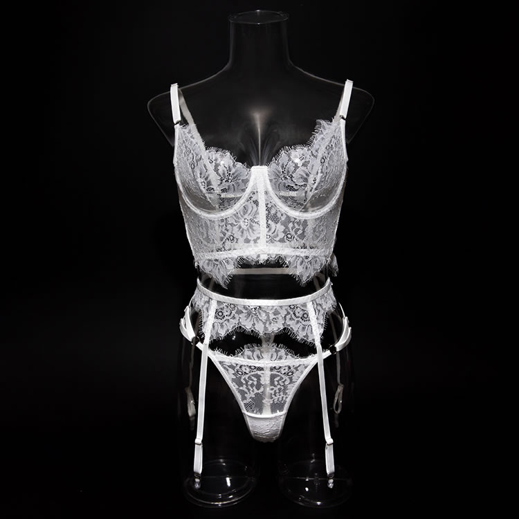 Delight your sweetheart with this seductive bra set, available in black and white. This three-piece collection features an underwire longline bra with adjustable straps and a hook and eye back closure, a garter belt with adjustable garter straps, and a matching thong panty, perfect for a memorable evening.
