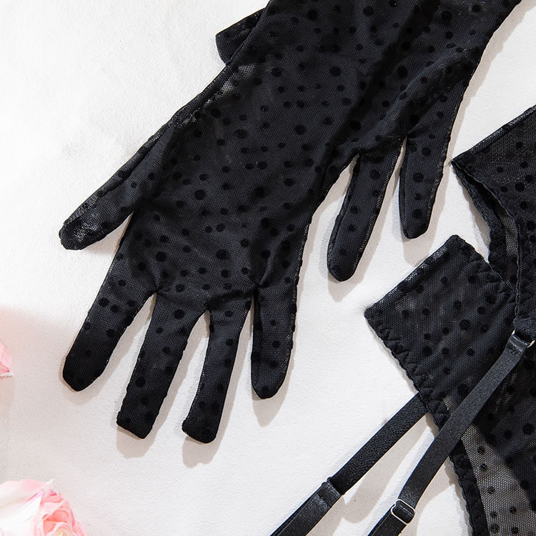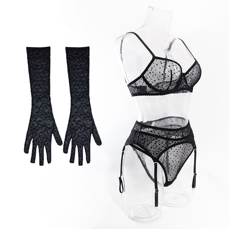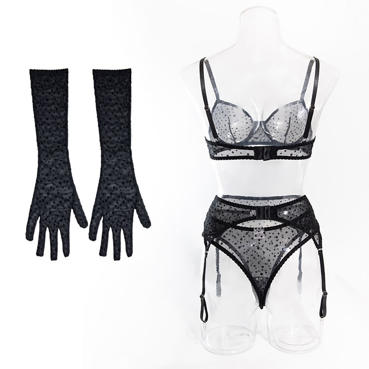 Make an unforgettable statement at your most special moments with this sensual bra set, available in black. This four-piece ensemble includes a sheer lace underwire bra with adjustable spaghetti straps and a hook and eye back closure, along with a garter belt featuring adjustable garter straps. Complete your look with a matching cheeky panty and gloves for added allure and sophistication.