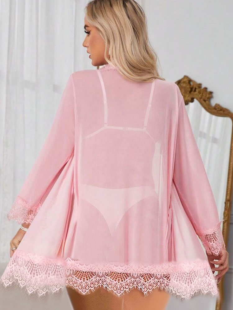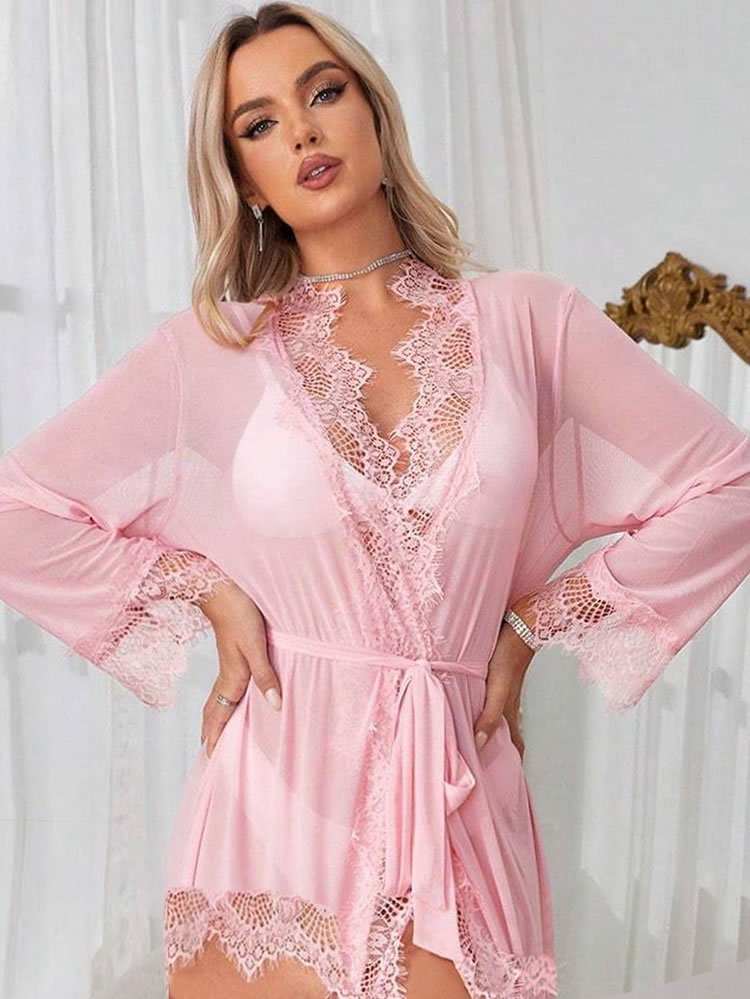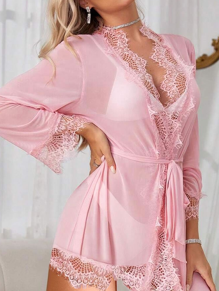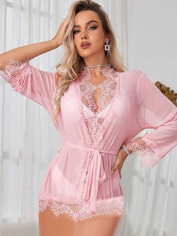 Flash your lover with a sexy surprise in this exclusive bra set featuring sheer mesh cups with an eyelash lace trim, long sleeves with a lace cuff, a waist belt, and a matching panty. (Bra and panty not included.)