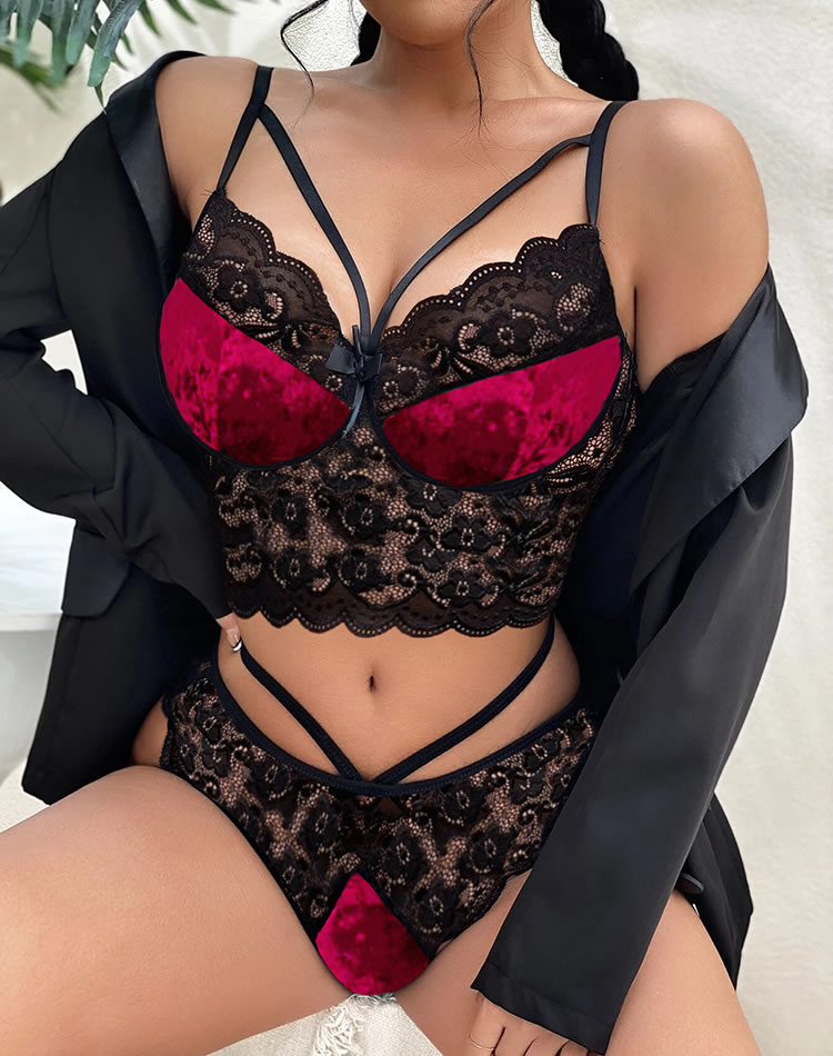 Seduce your sweetie in this lingerie set featuring a longline bra with soft cups, a scalloped lace trim, adjustable spaghetti straps, a hook and eye back closure, a matching high waisted panty.