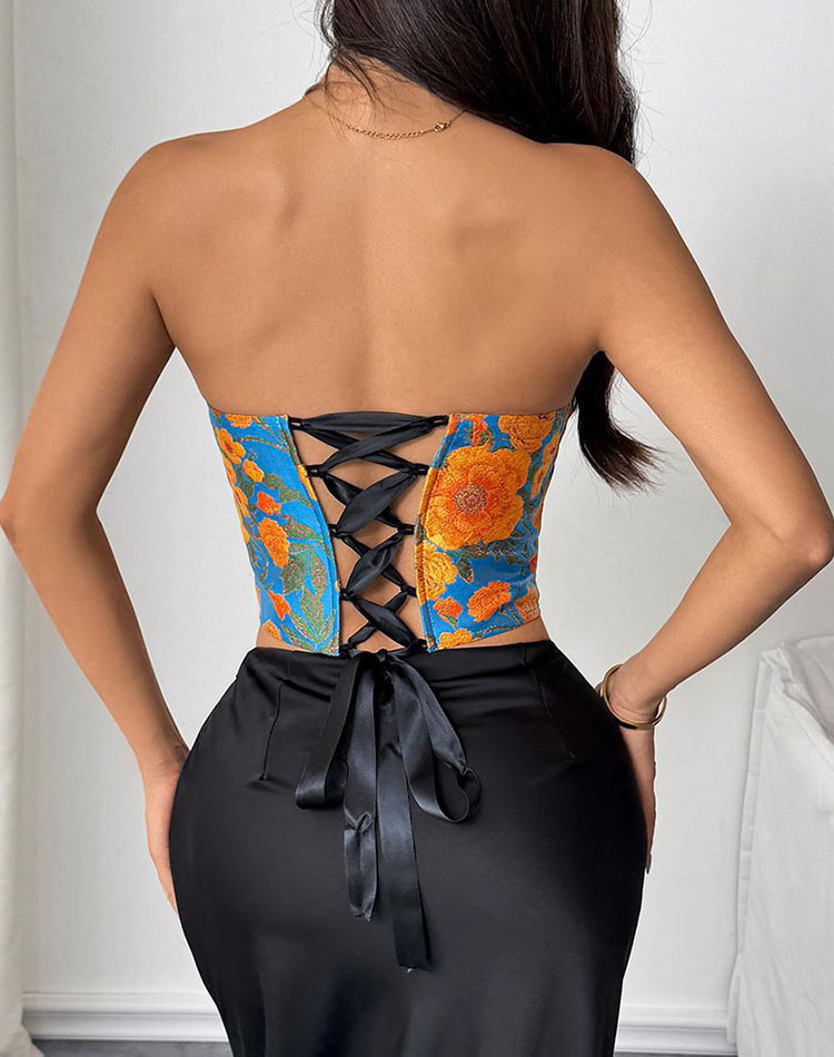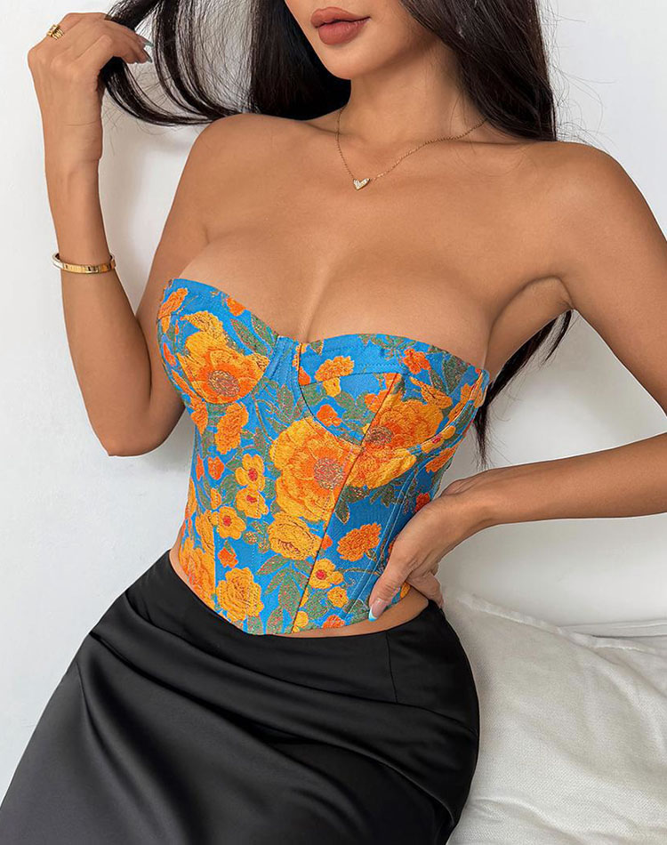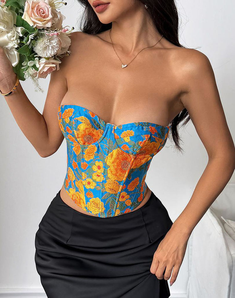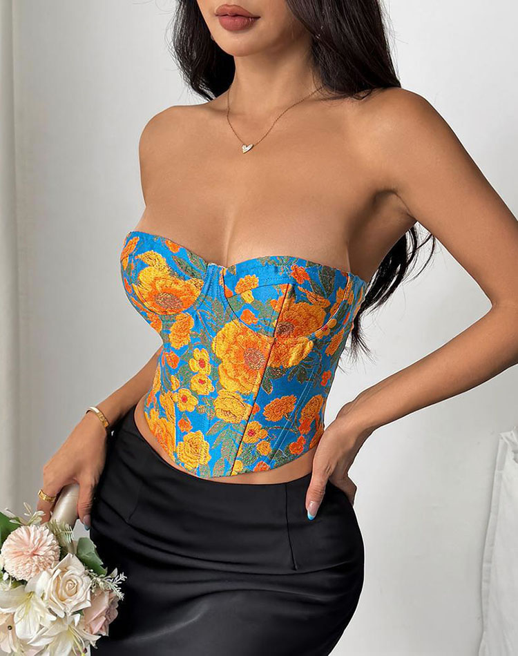 This eye-catching bustier features a bold floral pattern set against a vibrant blue background, creating a lively and colorful look. The structured design accentuates the waistline, offering both support and style. Perfect for adding a pop of color to any outfit, whether you're heading out for a night on the town or attending a special event.