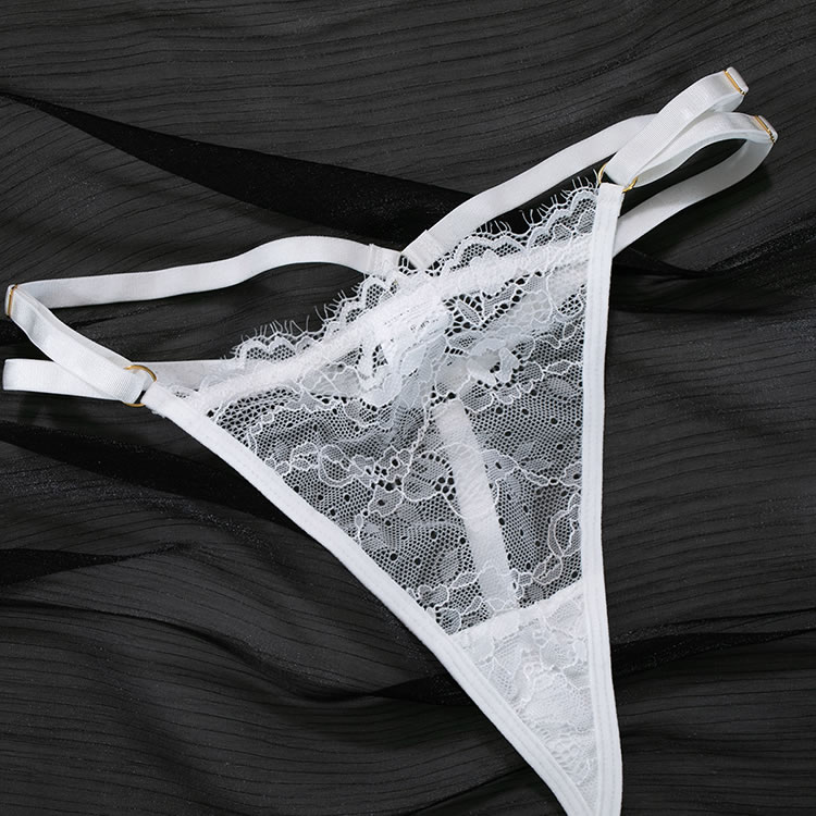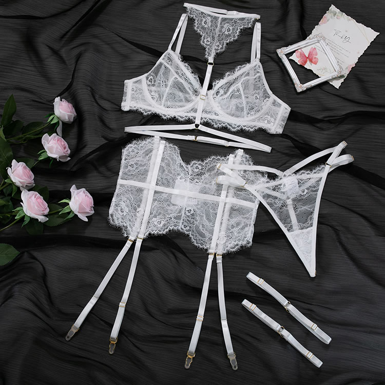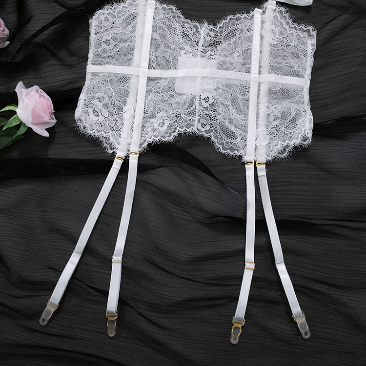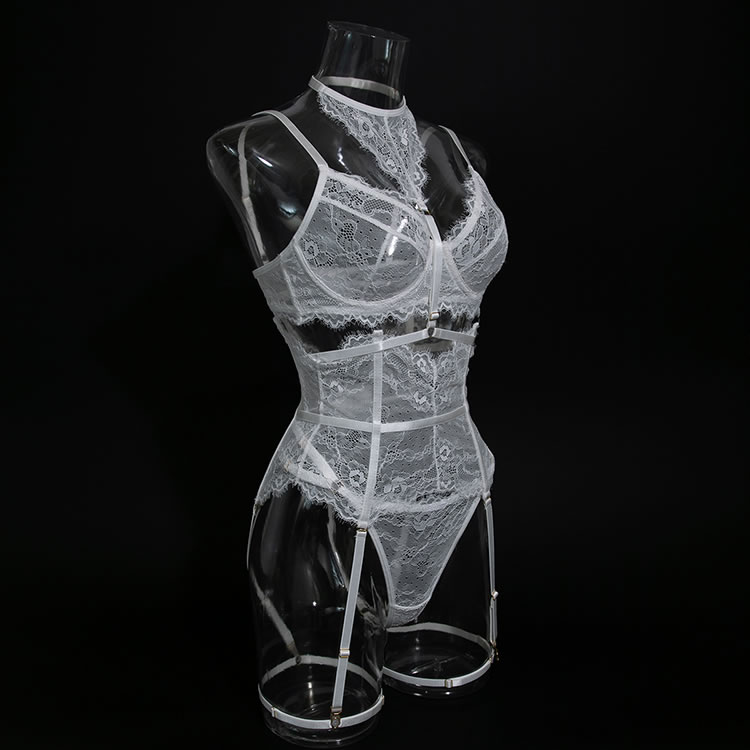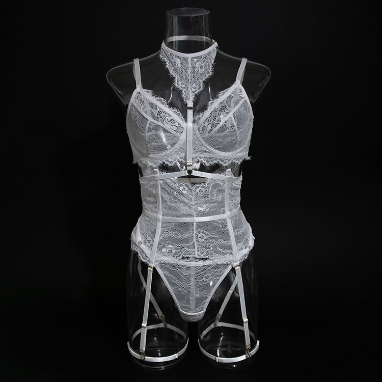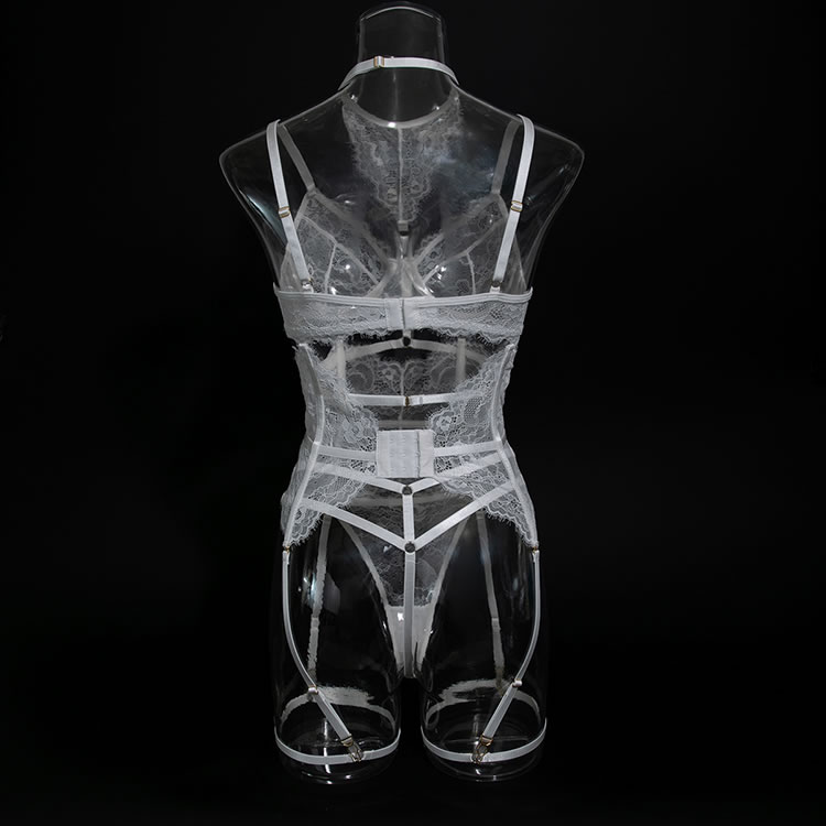 Tempt and tease in this exclusive lace bra set featuring sheer lace cups with underwire, adjustable spaghetti straps, a hook and eye back closure, a choker harness with sheer lace accents, a matching high waisted garter belt with a hook and eye back closure, adjustable garter straps with wraparound leg garters, and a matching panty with a thong cut back.