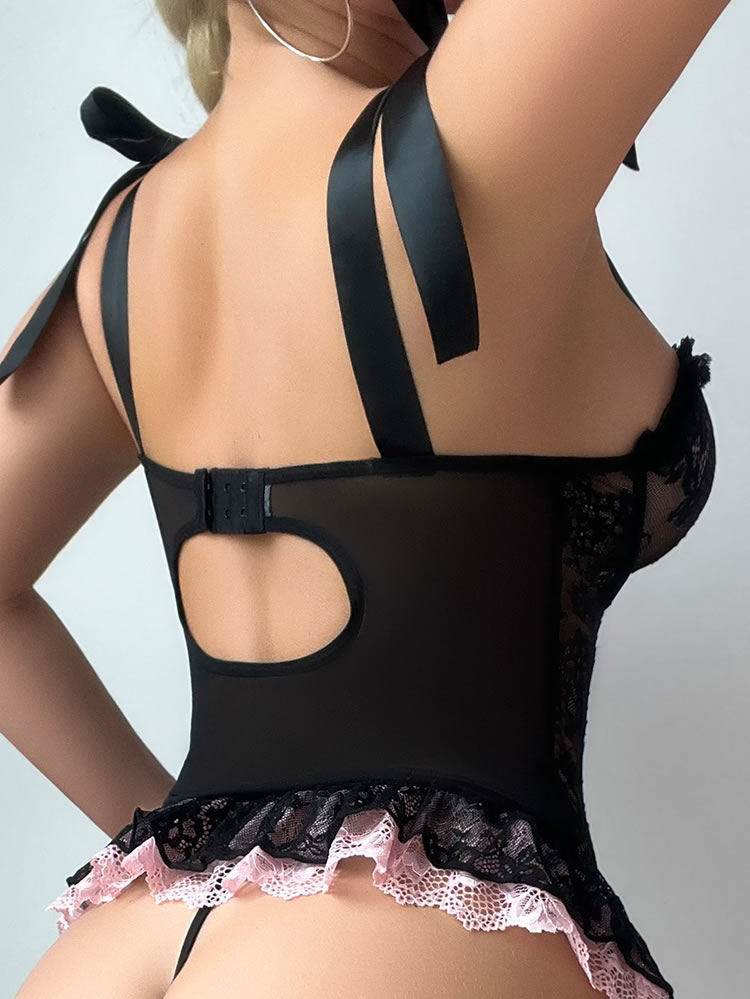 This playful yet bold lingerie set blends classic maid-inspired charm with a modern edge. The black lace corset features delicate floral patterns, a structured silhouette, and sweet pink bows at the front and hem for a touch of whimsy. With adjustable garters and a peek-a-boo cutout on the back, it’s designed to flatter your curves while adding a flirtatious twist to any intimate moment—perfect for fans of cute-meets-sexy styles.