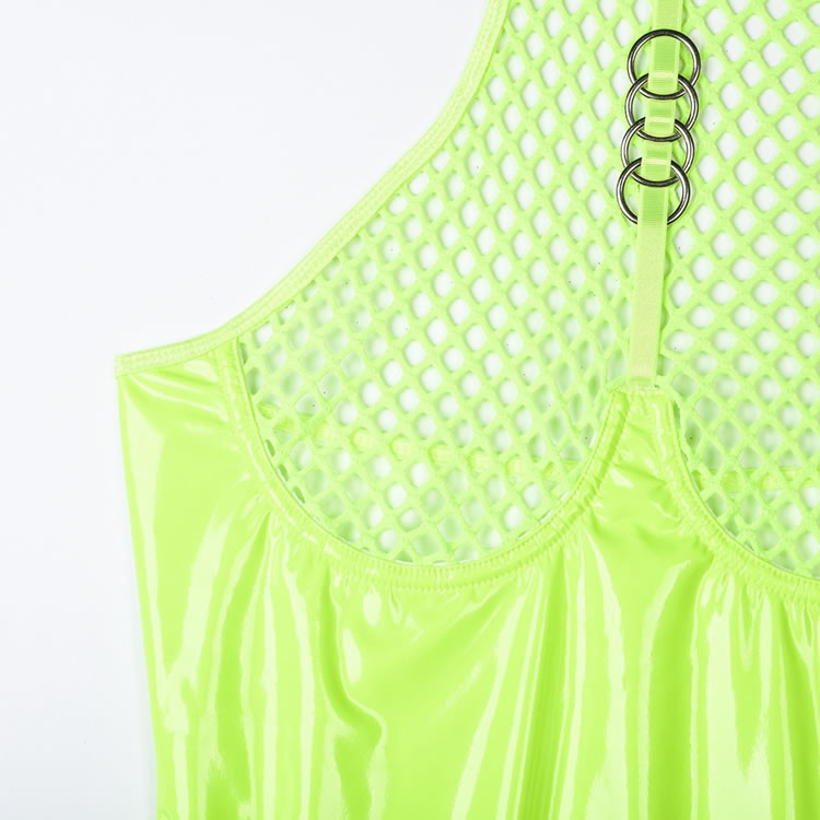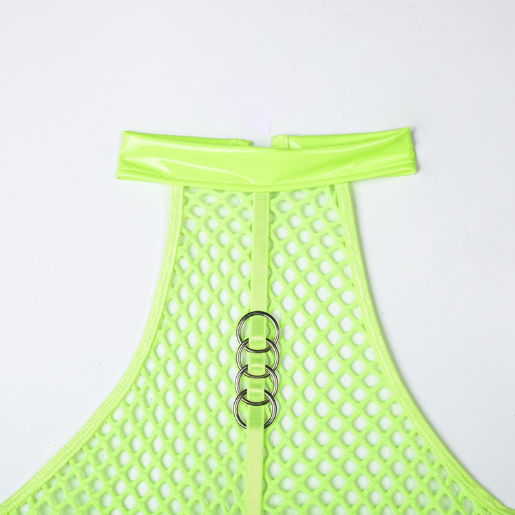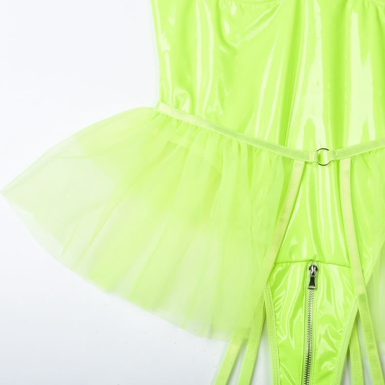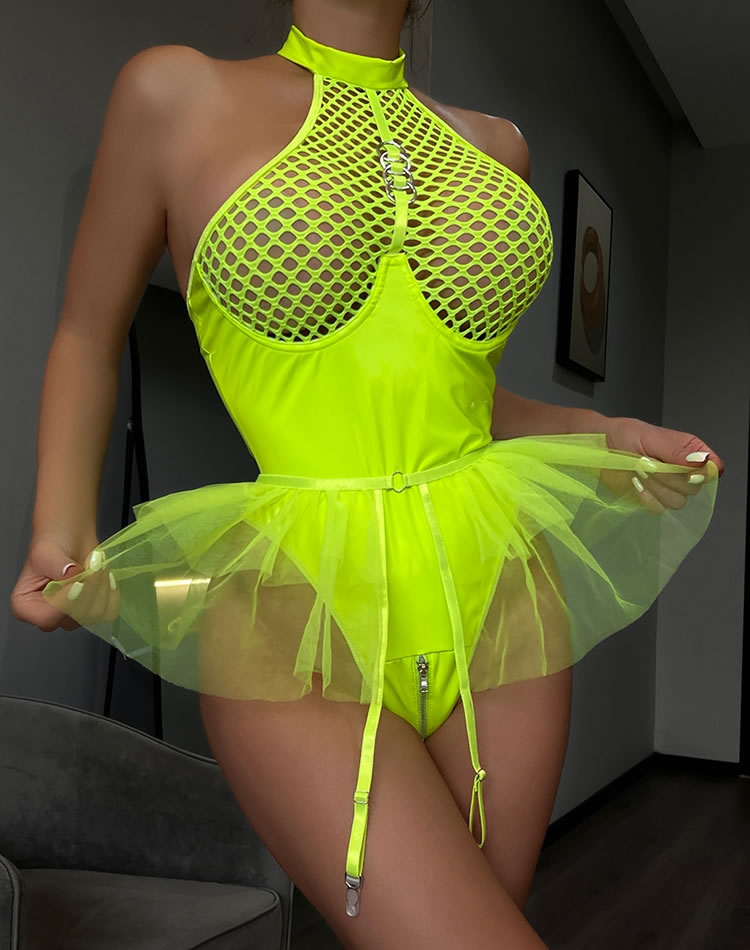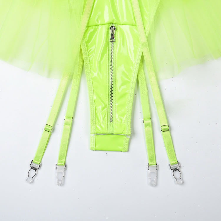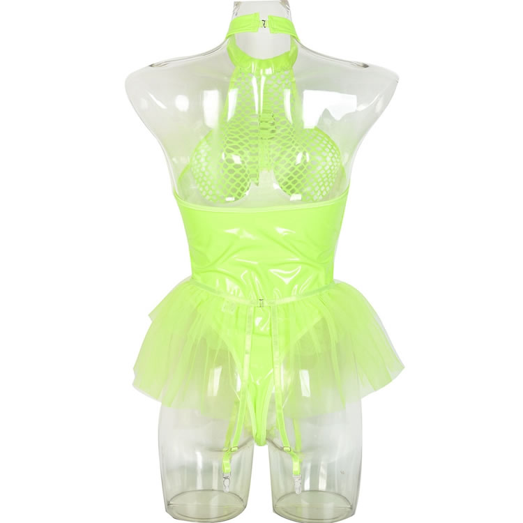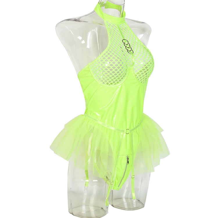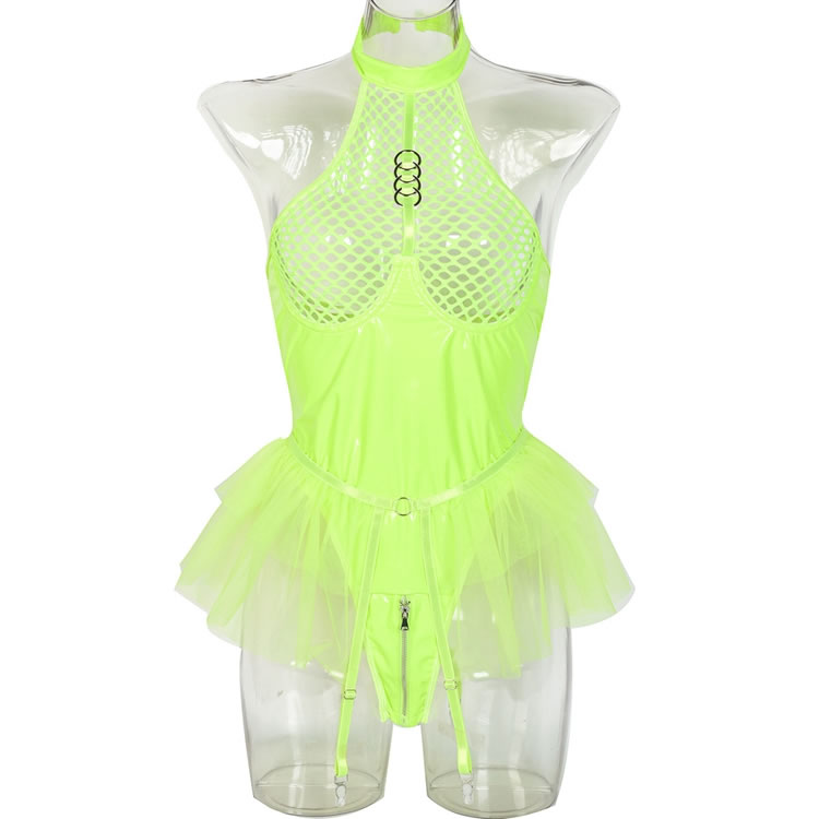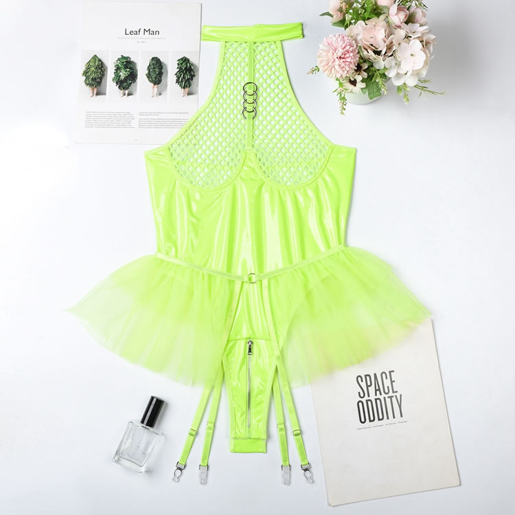 Dare to bare some skin in this sexy vinyl bodysuit featuring underwire cups, a high neckline, a wet look bodice, a thong cut back, and a matching garter skirt with adjustable garter straps.