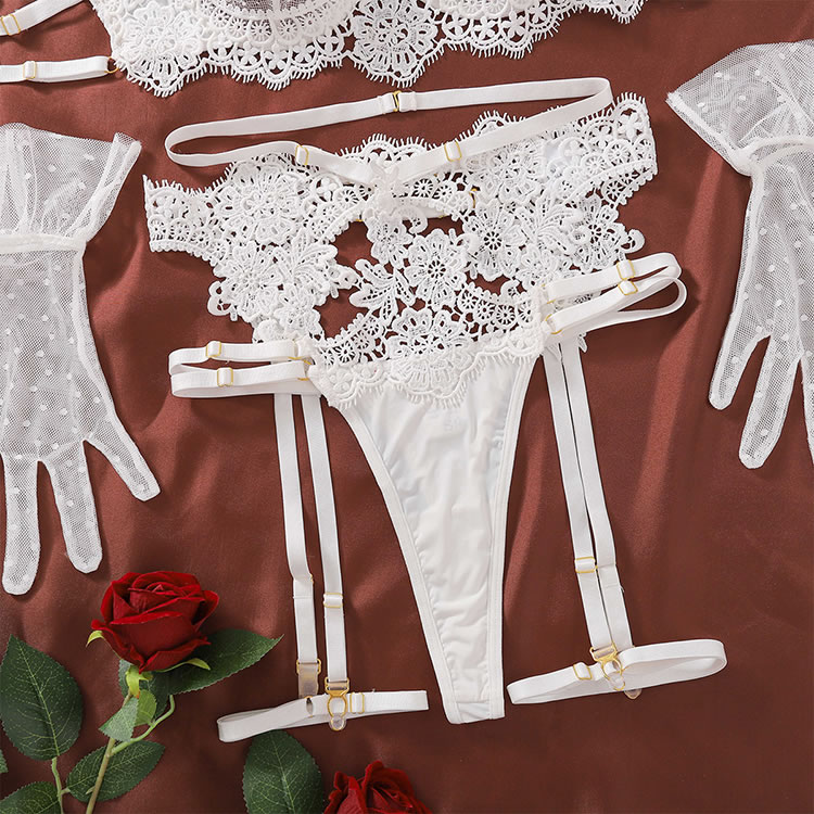 Turn up the heat with this alluring lace bra set, designed to captivate from every angle, especially the back. It features sheer lace underwire cups, adjustable spaghetti straps, a hook and eye back closure, and a coordinating garter belt with adjustable garter straps. Complete the look with the wraparound leg garters and matching thong for an unforgettable ensemble.