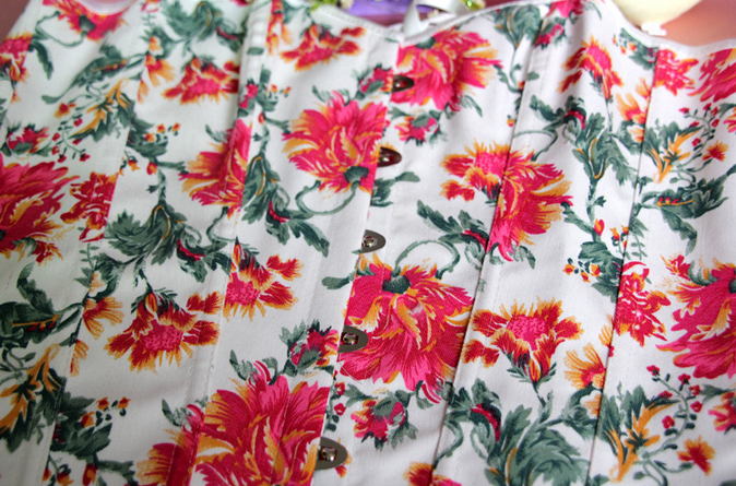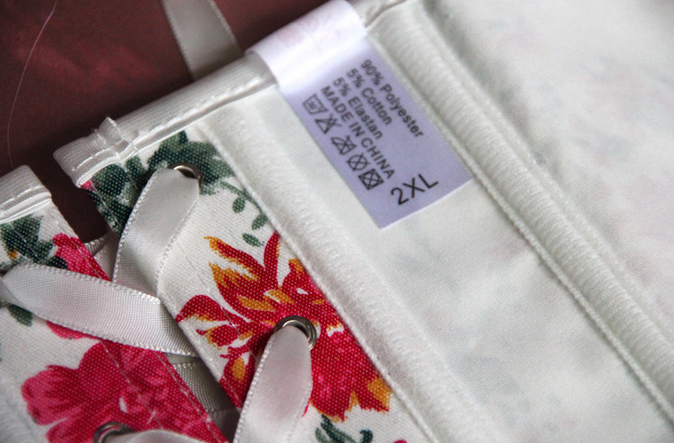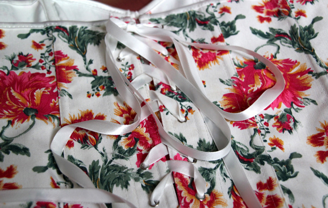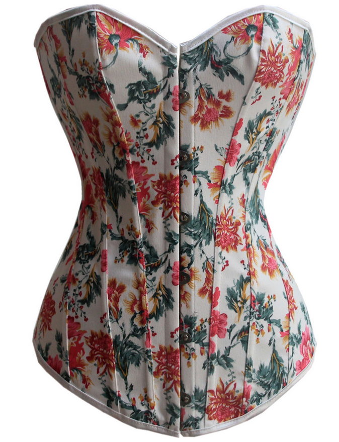 It is a floral designed corset which is made from a sturdy denim-style fabric for ease of cleaning and durability. The main body of the corset is white but it is liberally decorated with a summery red and blue floral design – perfect for the summer months but equally as gorgeous and elegant the whole year around.