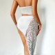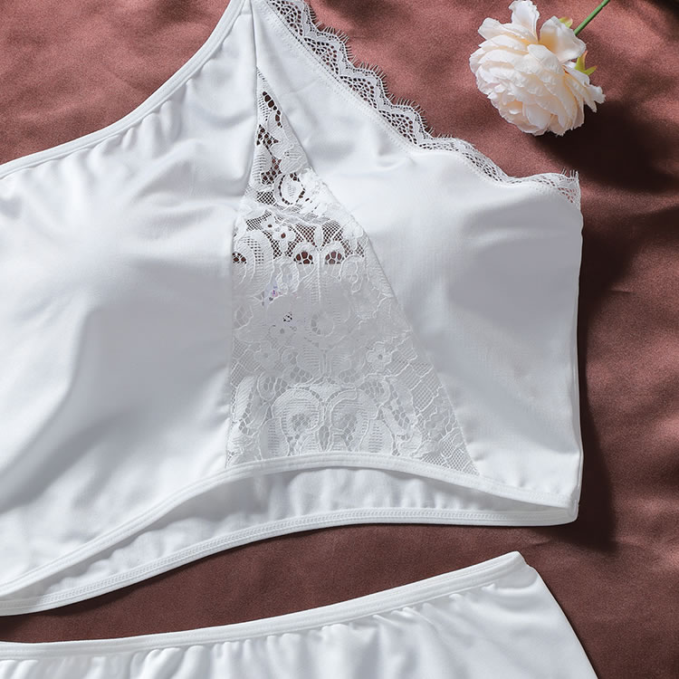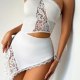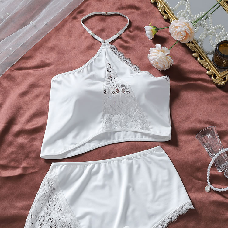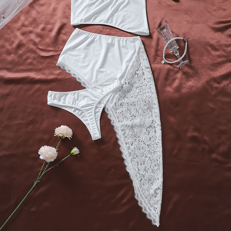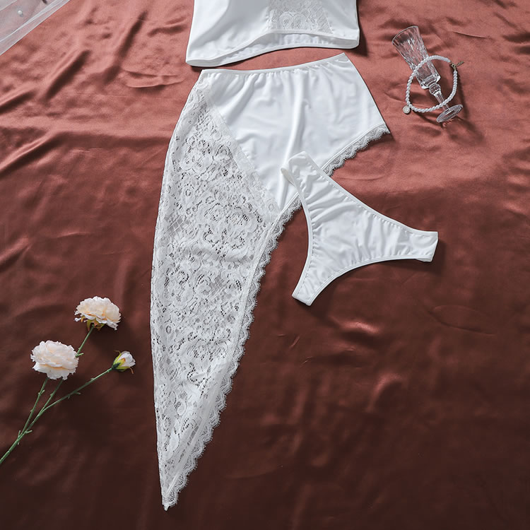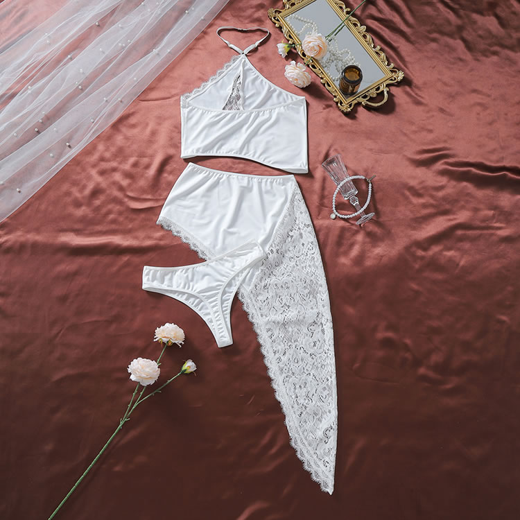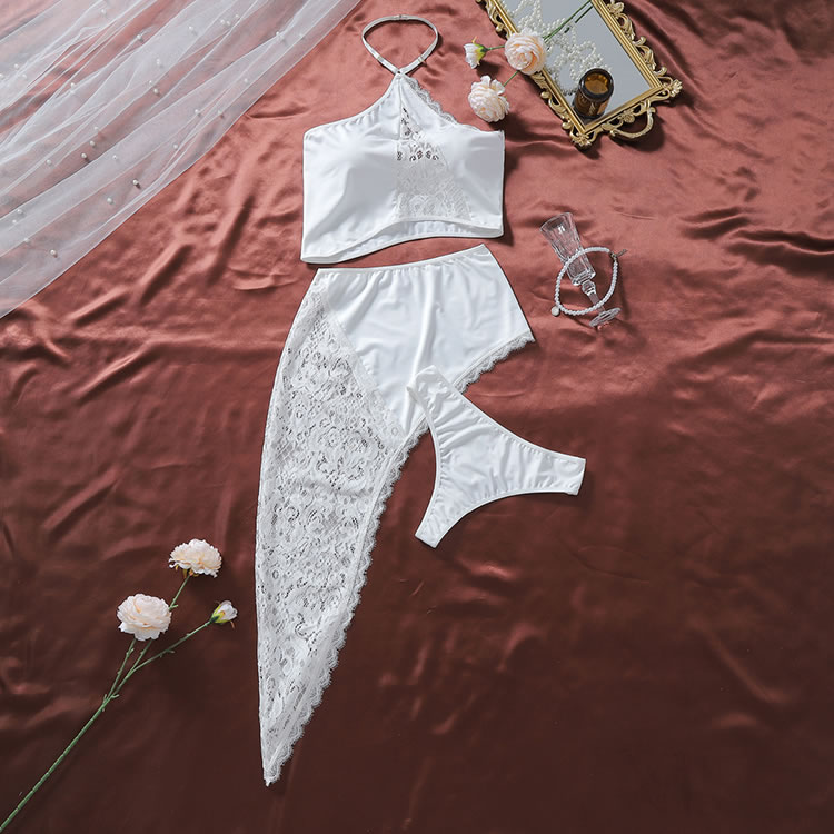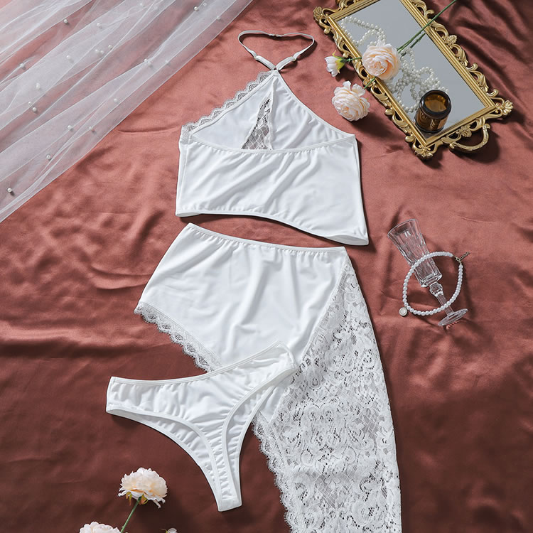 Step into the spotlight with this stunning white three-piece set, perfect for a bridal night or a romantic getaway. The ensemble features a chic halter crop top with delicate lace paneling that adds a touch of elegance. Paired with a matching high-waisted skirt, it boasts a daring asymmetrical design with a sweeping lace overlay that accentuates your curves and leg line. Complete with matching panties, this set offers a sophisticated and sexy look that is sure to impress.