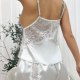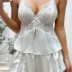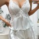 This charming two-piece set combines soft satin fabric with delicate lace detailing for a romantic and comfortable look. The top features a deep V-neckline with floral lace trim and a small bow at the center, adding a sweet touch. Adjustable spaghetti straps ensure a personalized fit, while the layered ruffle hem gives it a playful silhouette. The matching shorts are made from smooth satin with lace panels on the sides, creating a balanced blend of modesty and allure. Ideal for lounging or special moments at home.