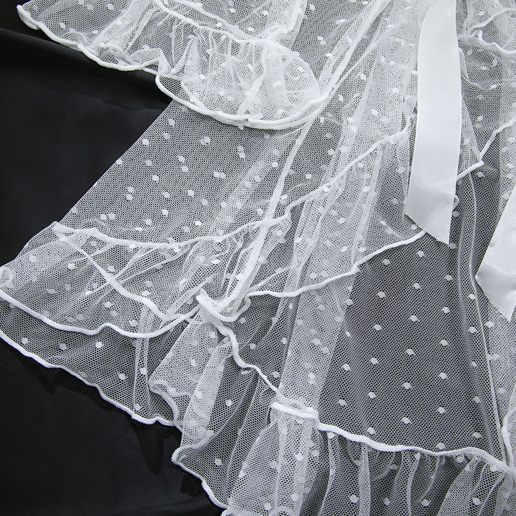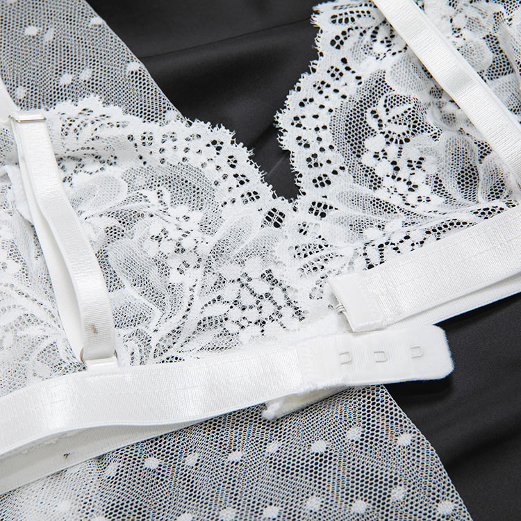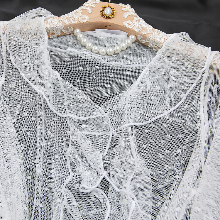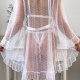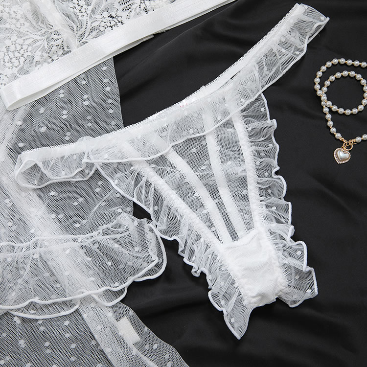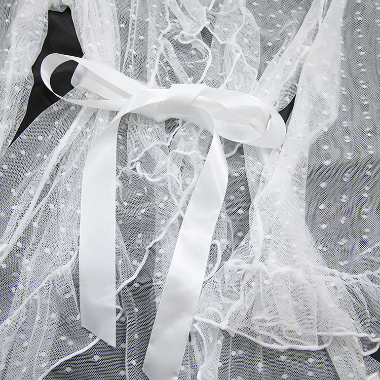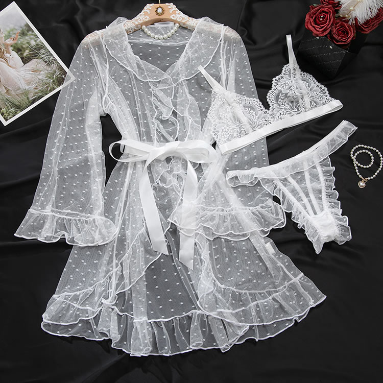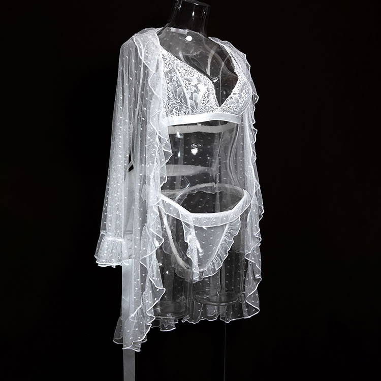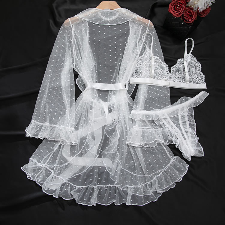 Designed to blend romance with boldness, this lingerie ensemble features a lace bra and high-cut thong in white. The sheer overlay robe is adorned with tiny polka dots and finished with ruffles along the cuffs and hem, enhancing its dreamy appeal. With a back tie closure and open design, it offers both comfort and style. Whether worn alone or layered, this set exudes confidence and grace for those who love a touch of drama in their nightwear.