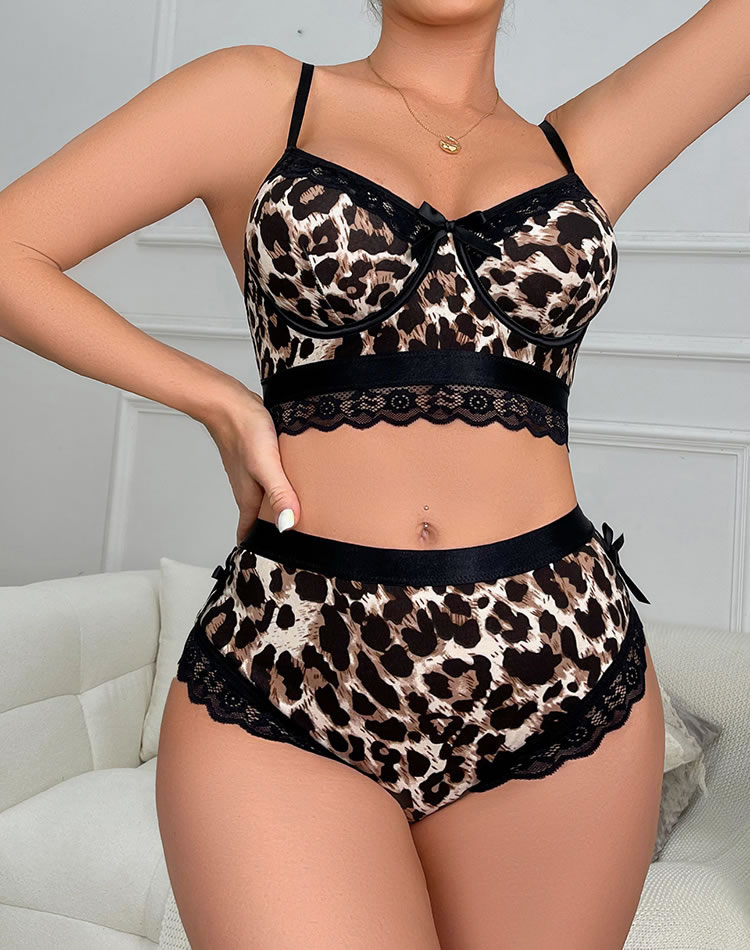 Go a little wild in this exclusive bra set featuring soft cups with an allover leopard print design, adjustable spaghetti straps, a hook and eye back closure, and a matching panty with cheeky cut back.