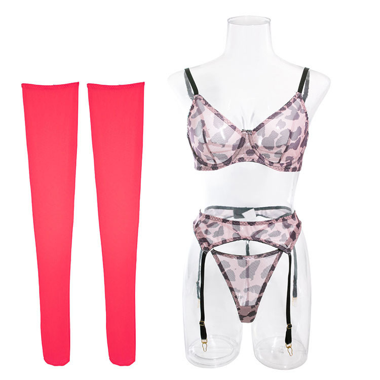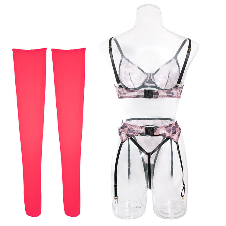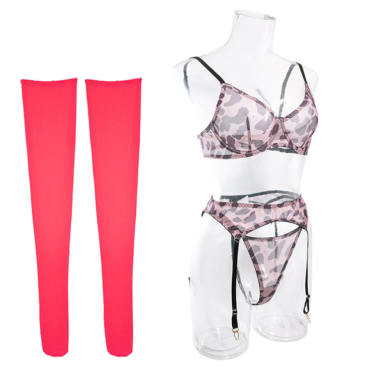 Go a little wild in this exclusive bra set featuring underwire cups with an allover leopard print design, adjustable spaghetti straps, a hook and eye back closure, a matching high waisted garter belt with adjustable garter straps, and a matching thong panty.(Included thigh high stockings.)