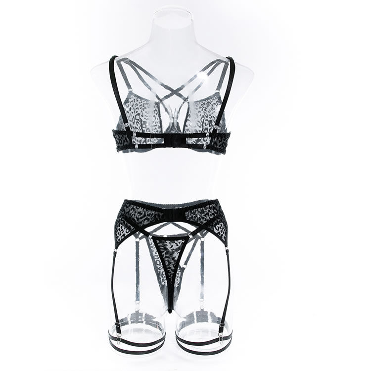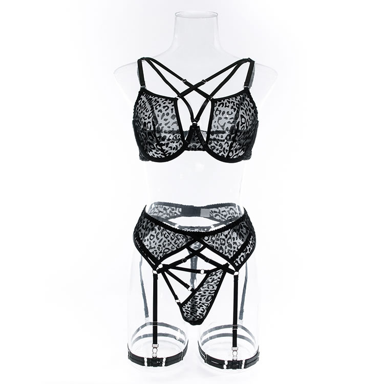 Give your lovers a show in this sultry bra set featuring sheer animal print mesh underwire cups with strappy bust detailing, adjustable spaghetti straps, a hook and eye back closure, a matching garter belt with adjustable garter straps, adjustable wraparound leg garters, a hook and eye back closure, and a matching thong panty.