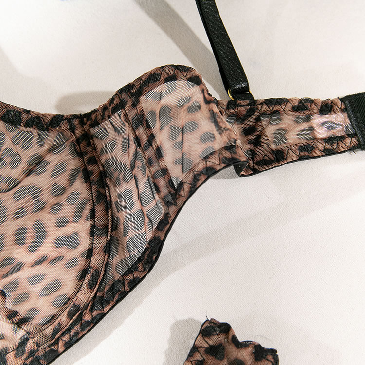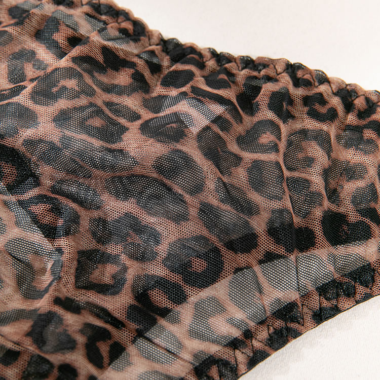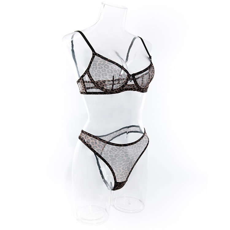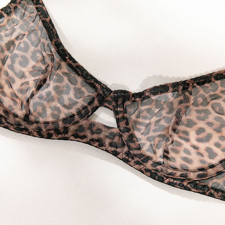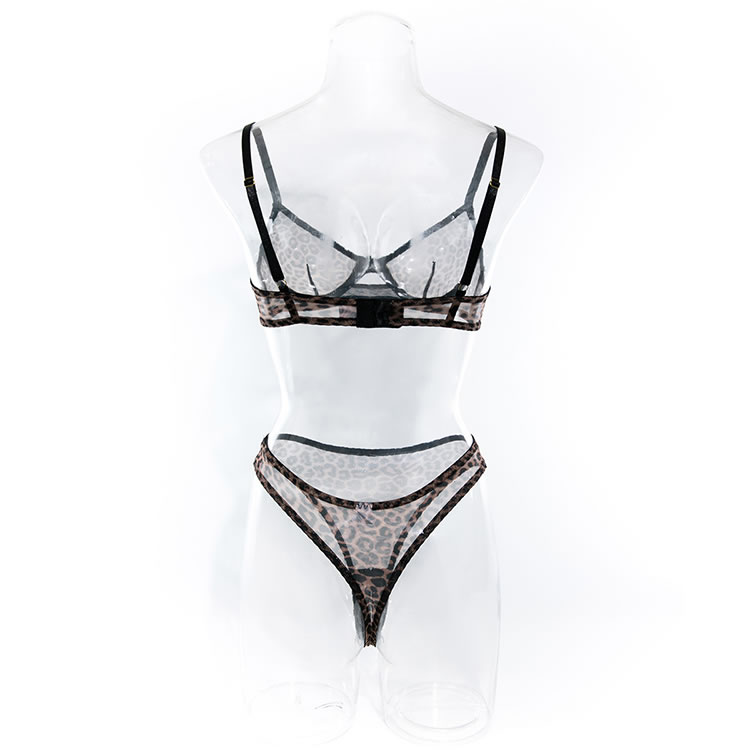 Go a little wild in this exclusive bra set featuring sheer mesh underwire cups with an allover leopard print design, adjustable spaghetti straps, a hook and eye back closure, and a matching panty with a cheeky cut back.