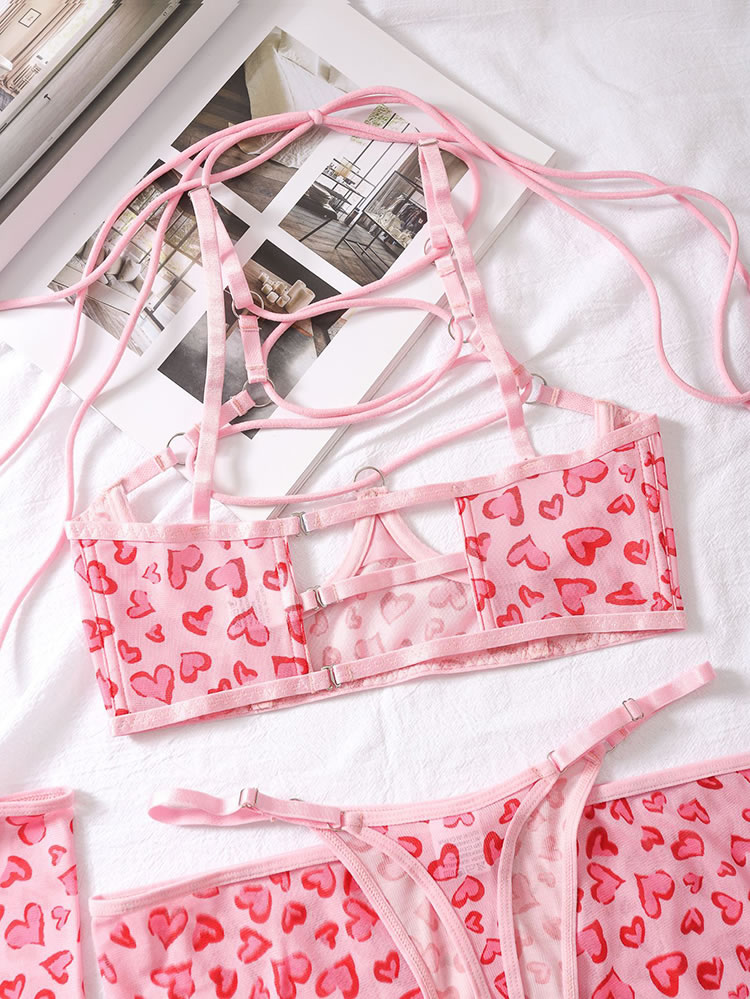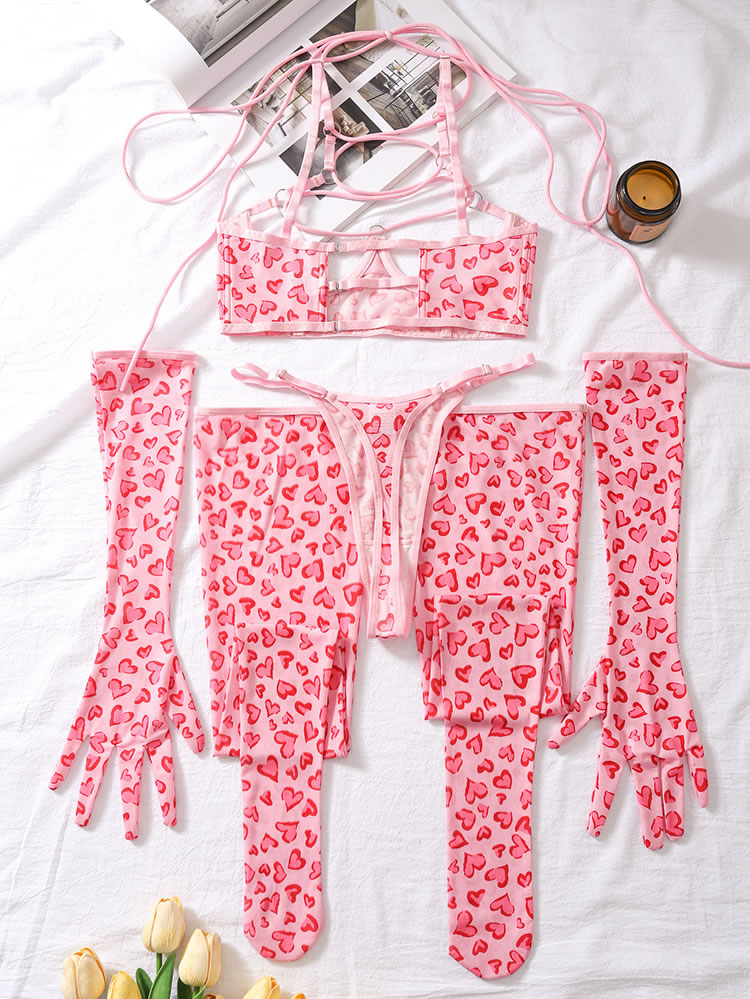 Unleash your inner animal with this exclusive bra set featuring open underwire cups with strappy detailing, an allover leopard print design, adjustable spaghetti straps, a three strapped back band with a hook closure, gloves, thigh high stockings, and a matching panty with a thong cut back.