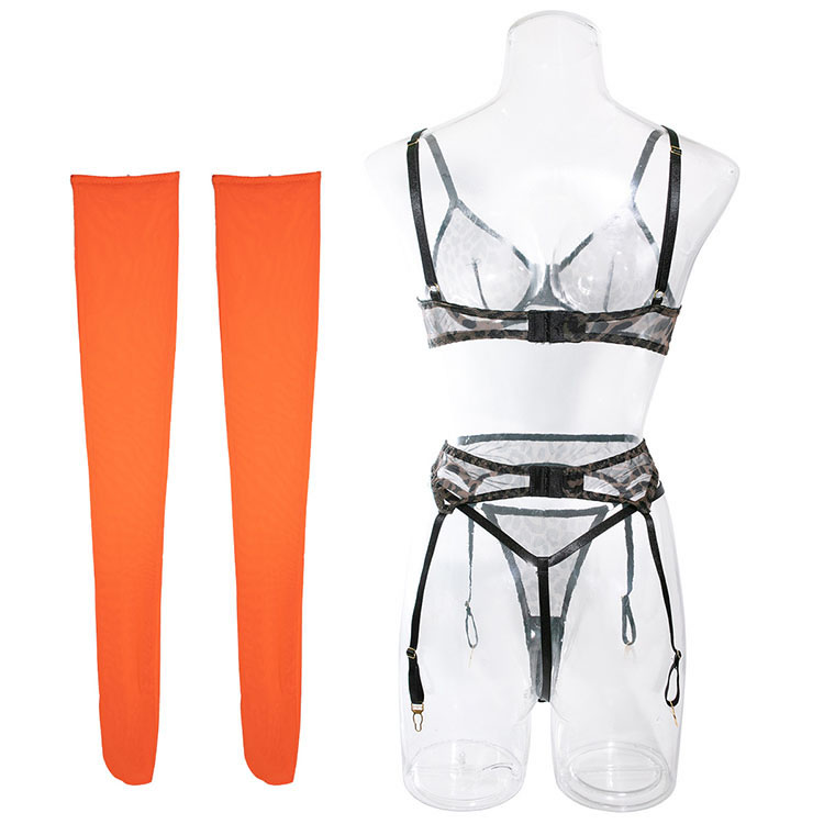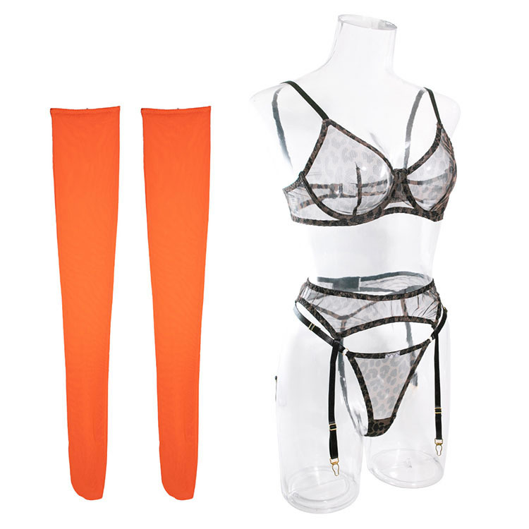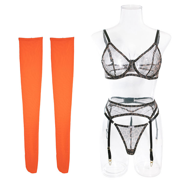 Unleash your animalistic side in this exclusive bra set featuring underwire cups with an allover leopard print design, adjustable spaghetti straps, a hook and eye back closure, a matching high waisted garter belt with adjustable garter straps, and a matching thong panty.(Included thigh high stockings.)
