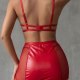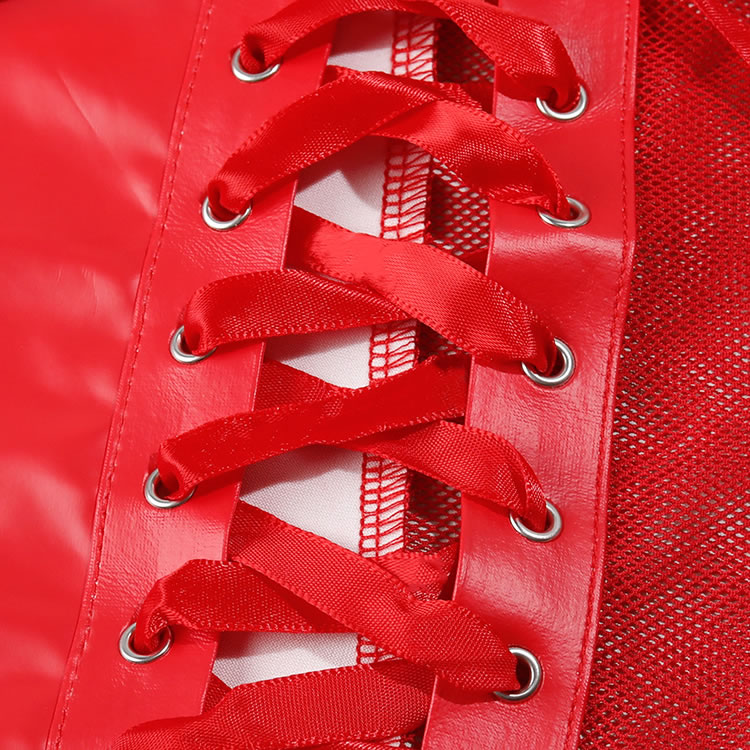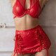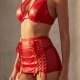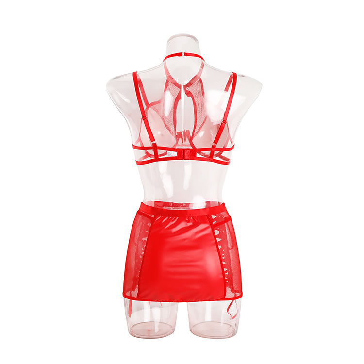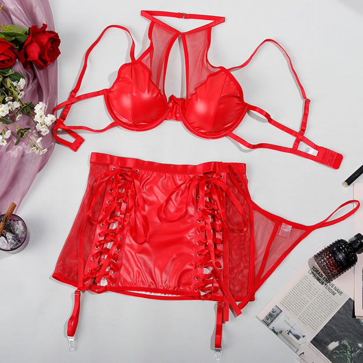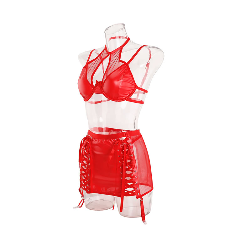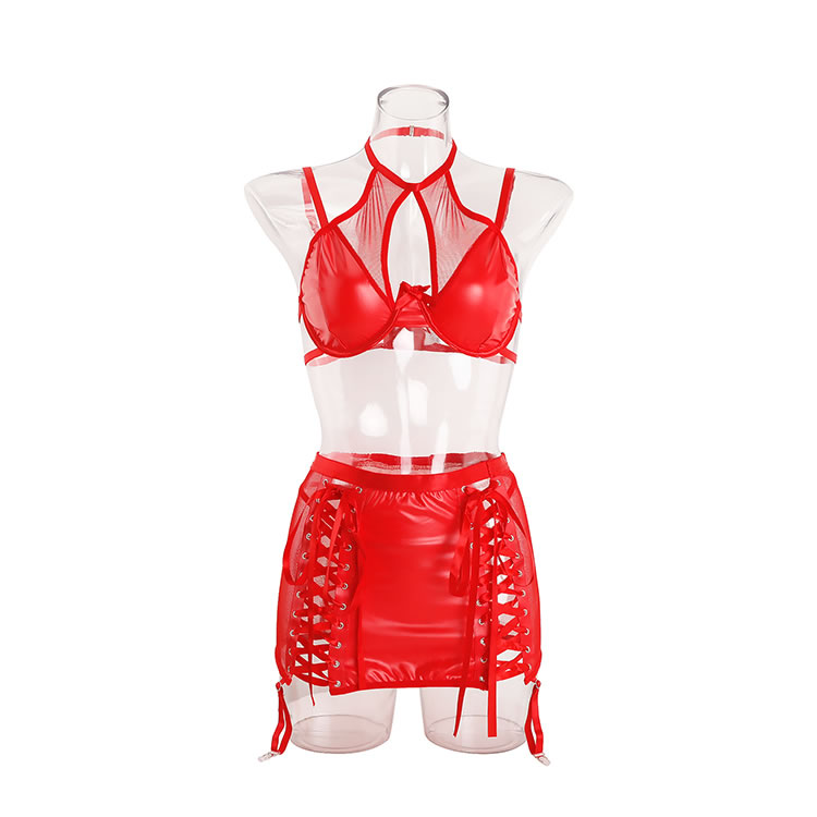 Turn up the heat with this electrifying lingerie set. Designed for the bold and confident, this three-piece ensemble features a supportive underwire bra with a playful mesh halter neckline and a delicate bow at the center. The matching mini skirt is the main event, crafted from a sleek, wet-look fabric with daring lace-up sides that allow for an adjustable, flirty fit. Complete with attached garter straps, this set is a vibrant and provocative choice for a night to remember.
