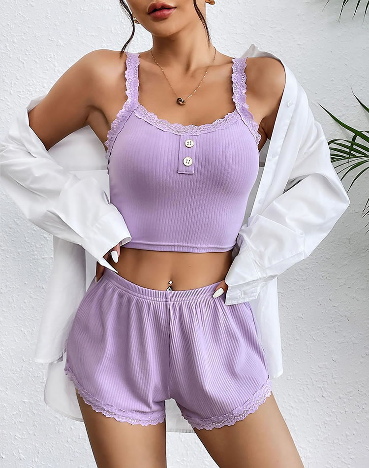 Women Soft Pajama Sets Sexy Lingerie Sleepwear Lace Cami Top with Pj Shorts 2 Piece Nightwear for Sleeping