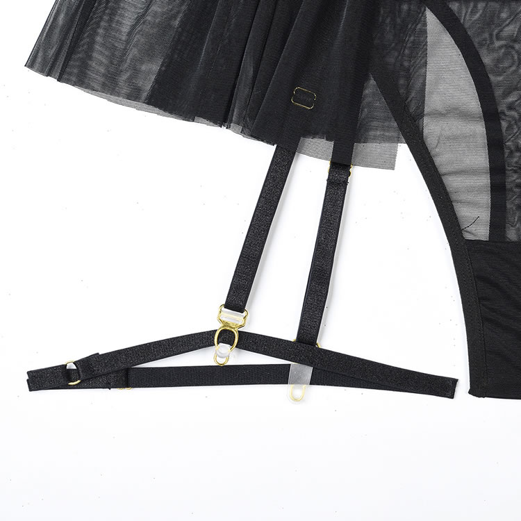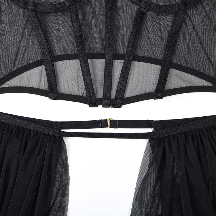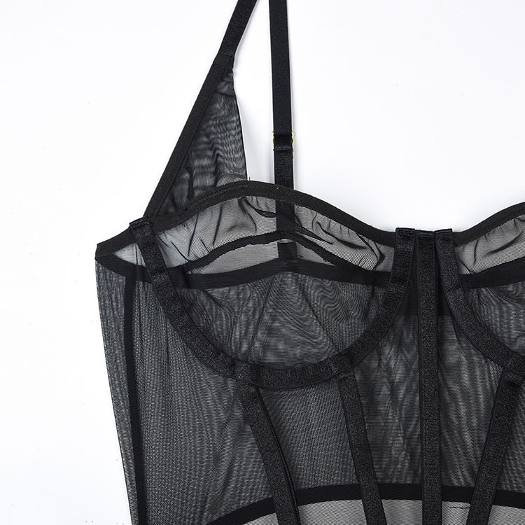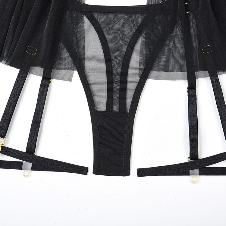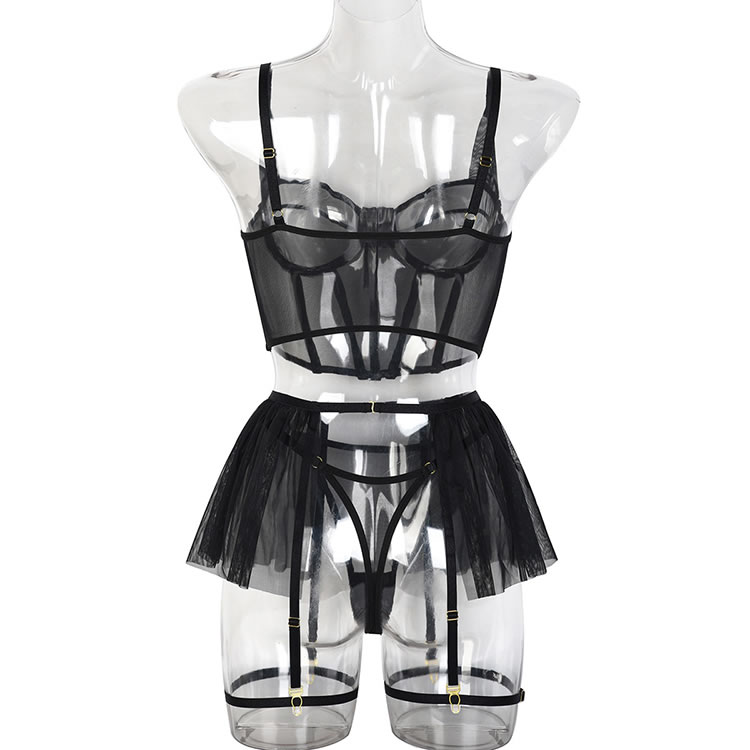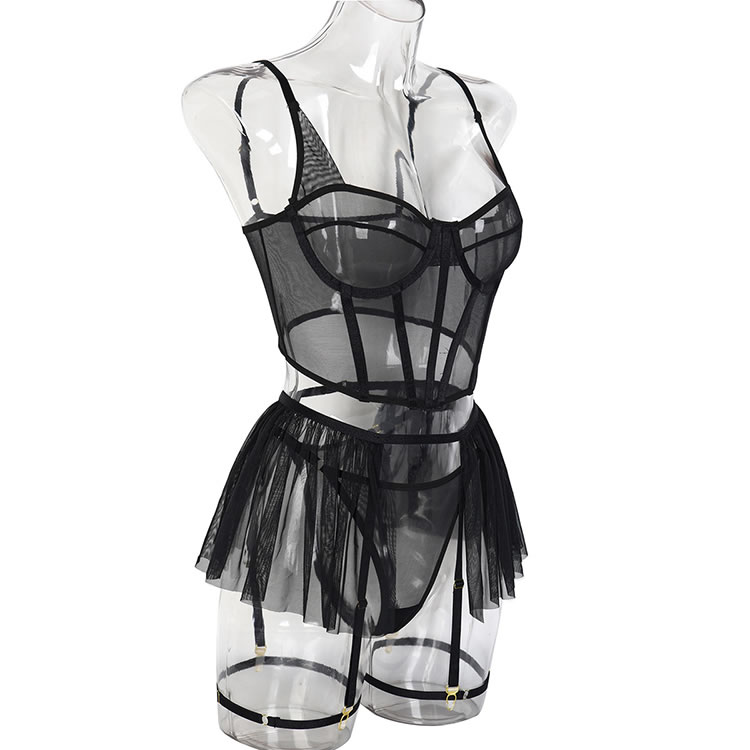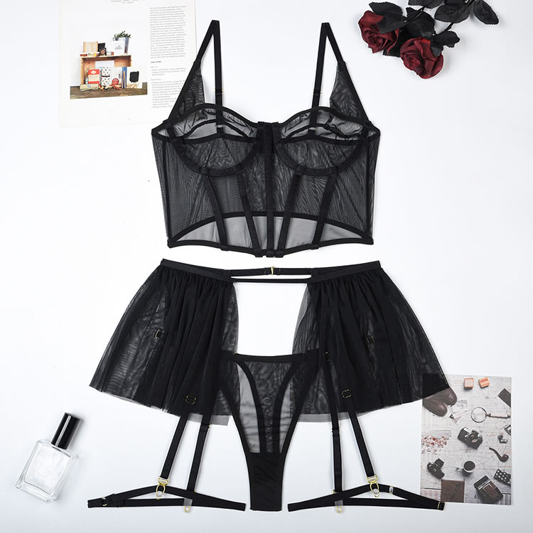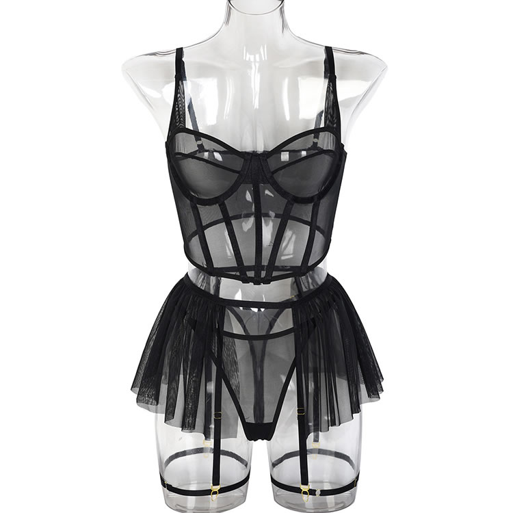 Reveal all your desires in this seductive bra set featuring sheer mesh cups, adjustable spaghetti straps, a longline mesh underbust, a matching high waisted garter belt with a back hook closure and adjustable garter straps, wraparound leg garters, and a matching panty with a Thong cut back.