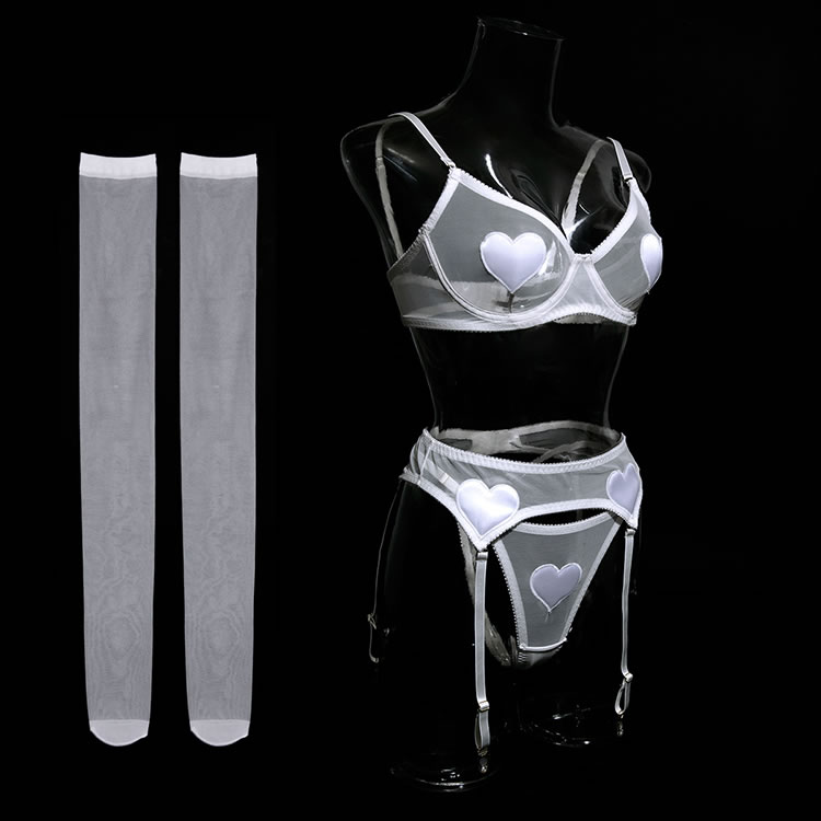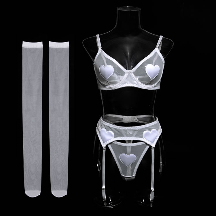 This exquisite lingerie set features a stunning white design with heart-shaped accents, combining elegance and romance. The sheer mesh fabric enhances the décolletage beautifully, while the sweetheart neckline adds a touch of allure. The fitted design accentuates the figure, creating a flattering and elegant silhouette. The adjustable straps and garter belt ensure a comfortable and customizable fit, making it perfect for both intimate moments and stylish boudoir photoshoots.