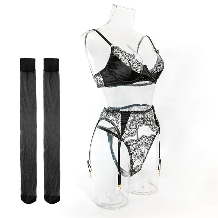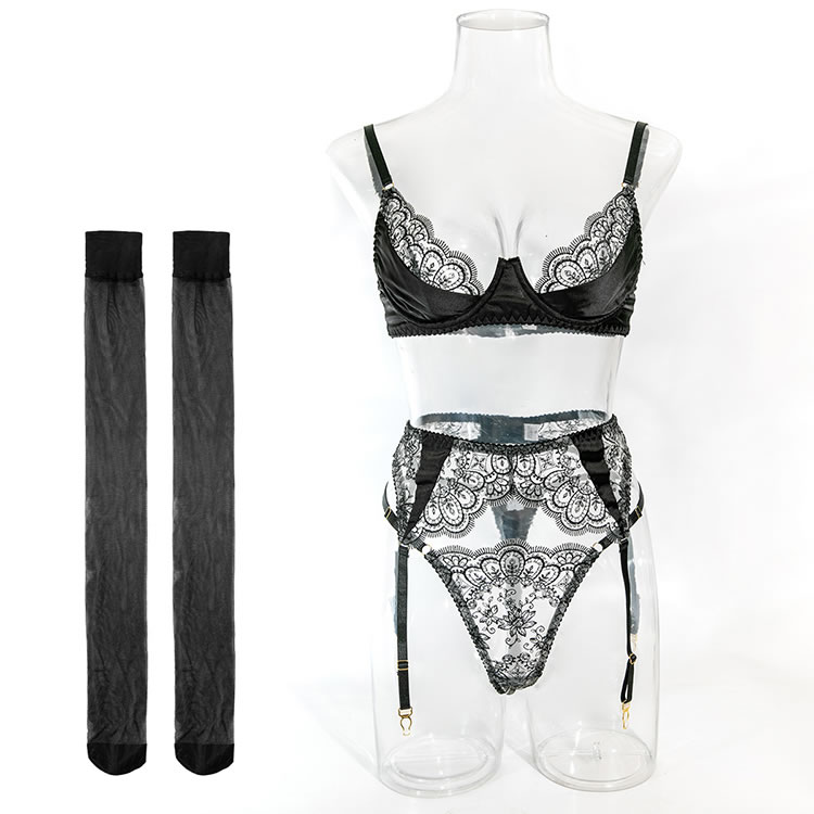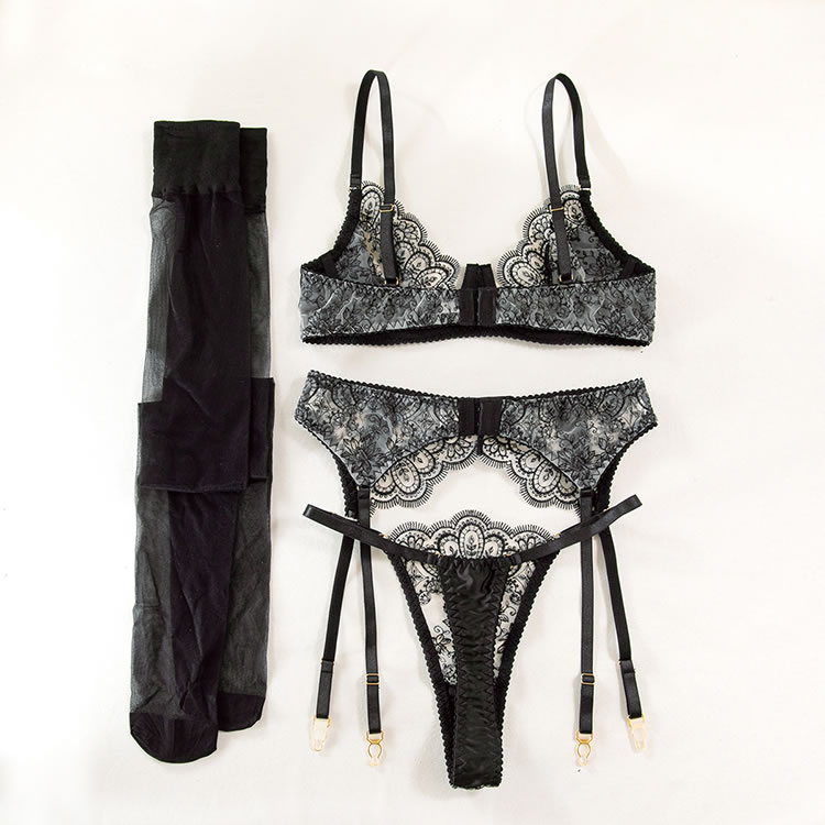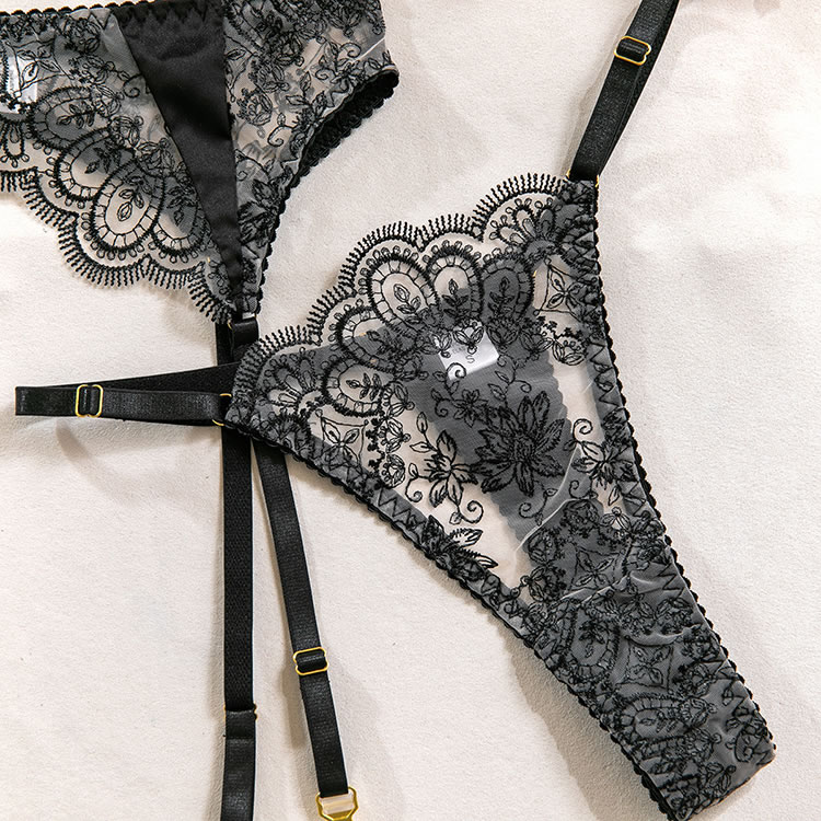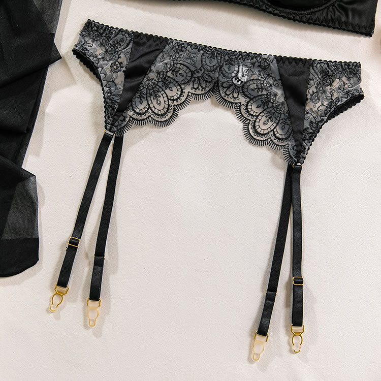This exquisite lingerie set features a stunning black design with intricate lace detailing and sheer mesh fabric. The sweetheart neckline enhances the décolletage beautifully, while the strappy accents add a touch of allure and sophistication. The fitted design accentuates the figure, creating a flattering and elegant silhouette. The adjustable straps and garter belt ensure a comfortable and customizable fit, making it perfect for both intimate moments and stylish boudoir photoshoots.