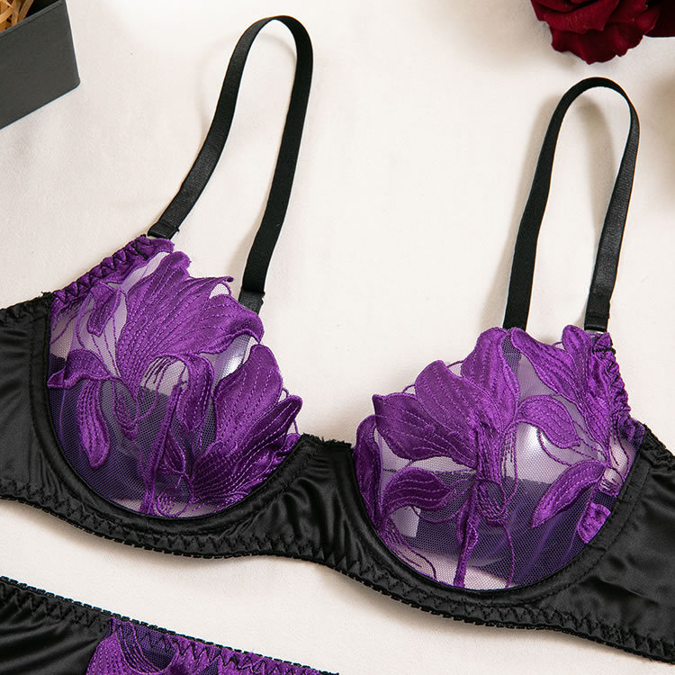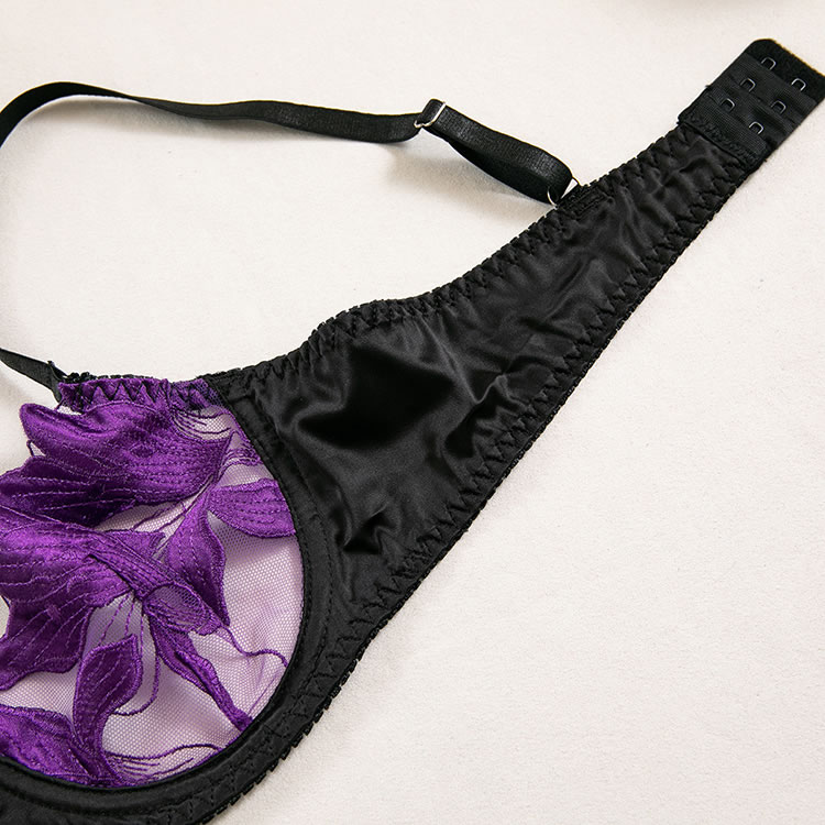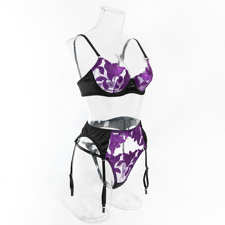 This exquisite lingerie set features a stunning combination of deep purple and black, with intricate floral lace detailing. The sweetheart neckline enhances the décolletage beautifully, while the sheer mesh fabric adds a touch of allure and romance. The fitted design accentuates the figure, creating a flattering and elegant silhouette. The adjustable straps and garter belt ensure a comfortable and customizable fit, making it perfect for both intimate moments and stylish boudoir photoshoots.
