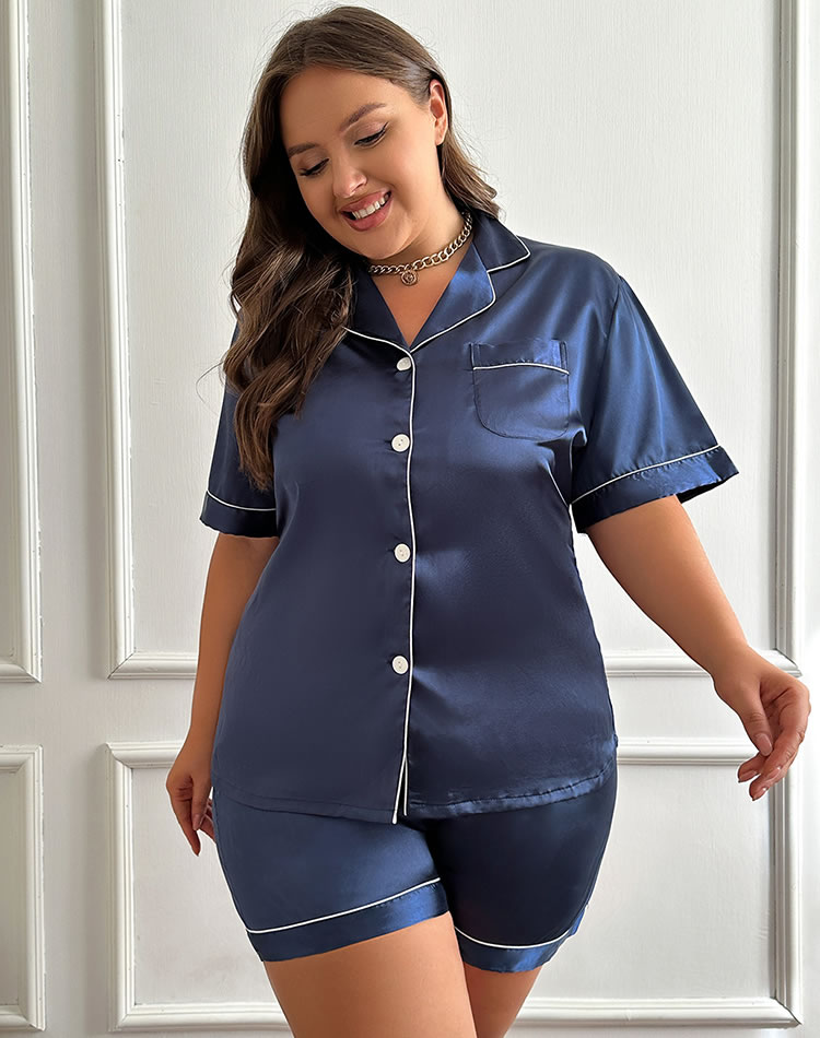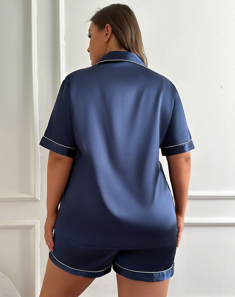 Step into charm with this navy blue satin sleepwear set. The sleek top has a button-down front and white trim details, providing a chic look. Paired with matching shorts, this set offers both style and comfort. Ideal for cozy evenings at home or as a fashionable addition to your loungewear collection.