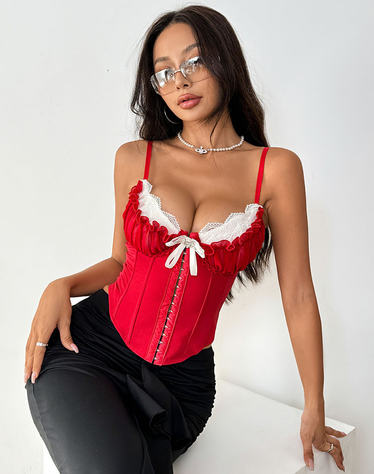 Make a chic statement with this red corset top featuring white lace trim. The sweetheart neckline and ruffled detail add a touch of elegance, while the structured fit ensures comfort and support.