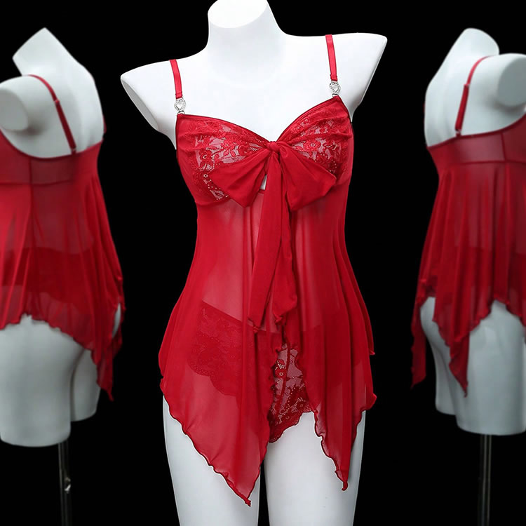 Elevate your evening with this bold red lace lingerie set featuring a flirty, flowing overlay that drapes elegantly over a delicate lace underbust design. The adjustable spaghetti straps and front tie detail add a touch of playful charm, while the sheer fabric enhances its sensual appeal. Perfect for intimate moments or a romantic night in, this piece combines comfort with captivating style.
