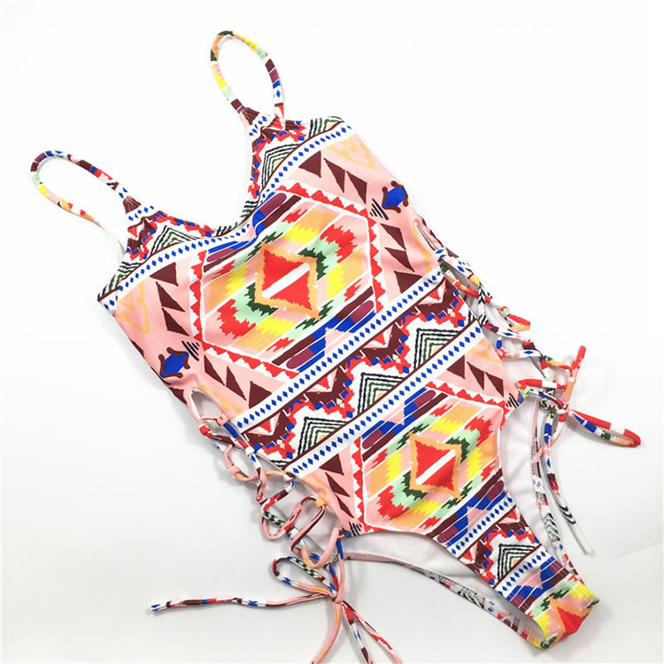 Bask in the sun in this exclusive swimsuit featuring a colorful geometric design, a scoop neckline, open side panels with lace-up detailing, a deep scoop back, high cut sides, and a cheeky cut back.